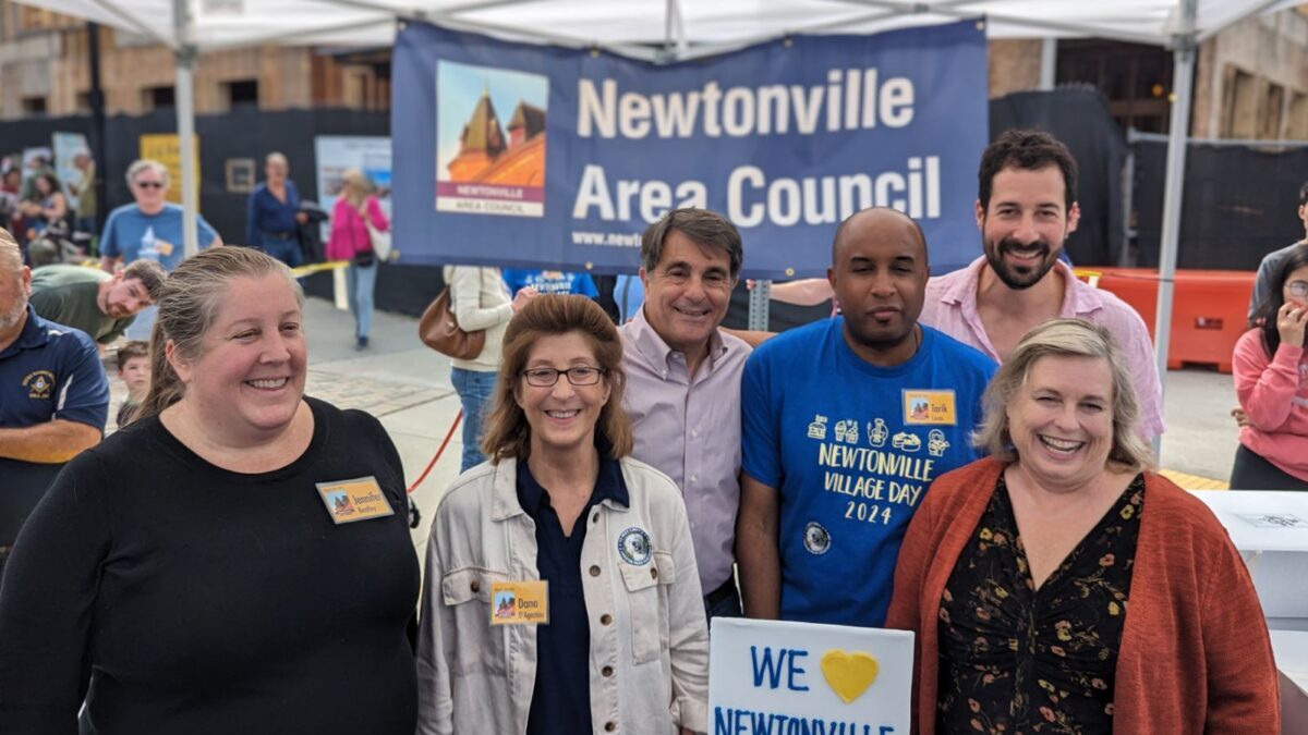 Newtonville Area Council President Jennifer Bentley and Treasurer Dana D'Agostino pose for a photo with city councilors Marc Laredo, Tarik Lucas, David Micley and Pam Wright at Newtonville's Village Day on Sunday, Sept. 29, 2024. Photo by Bryan McGonigle