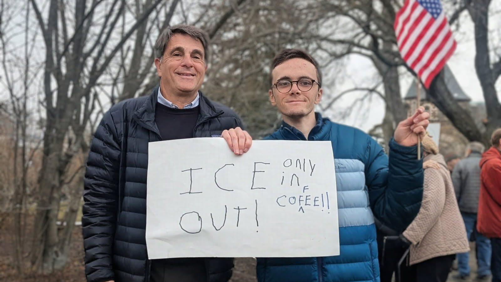 Marc Laredo, shown here with Nathan Persampieri, attends a protest against the Trump administration and Immigration & Customs Enforcement in Newton Centre on Jan. 10, 2026. Photo by Bryan McGonigle