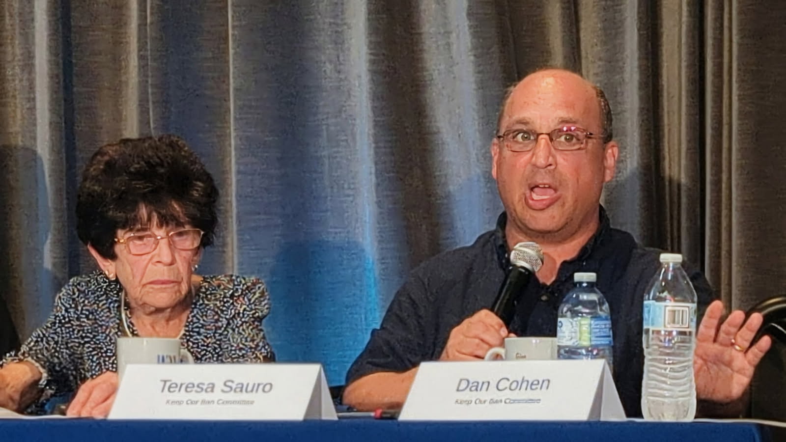 Dan Cohen and Terry Sauro speak against repealing Newton's winter parking ban during a League of Women Voters debate on October 7, 2025. Photo by Bryan McGonigle