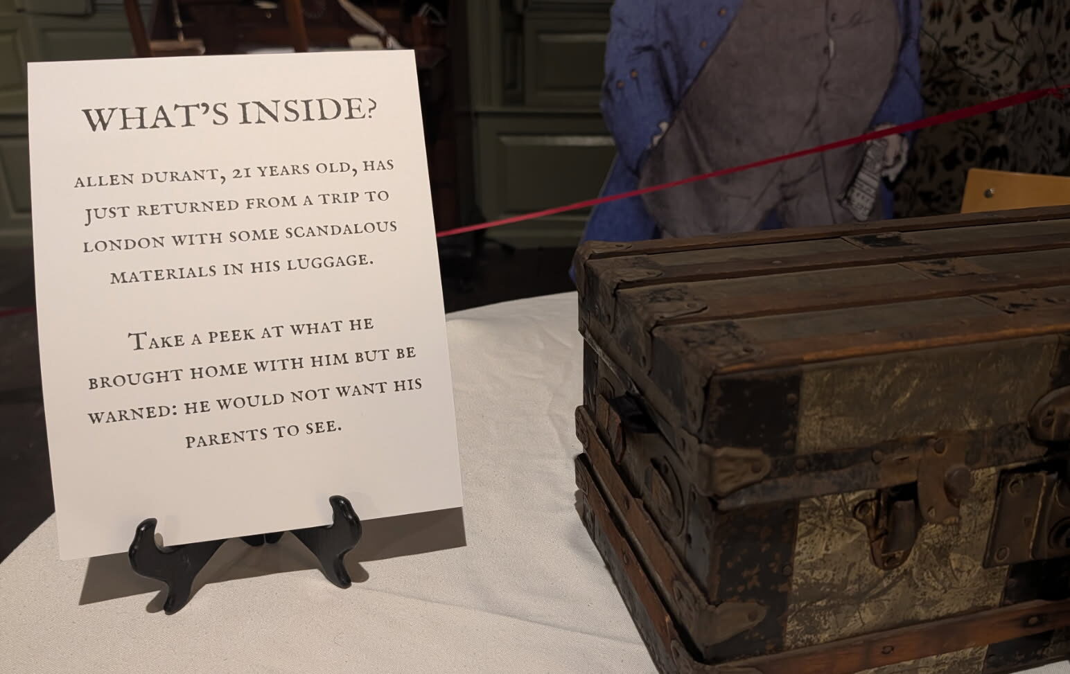 Downstairs, there was a room with only a wooden box and a sign indicating that it belonged to Allen Durant, who fought in the Revolutionary War. He went abroad to Europe at age 21 and returned with the contents of the box.