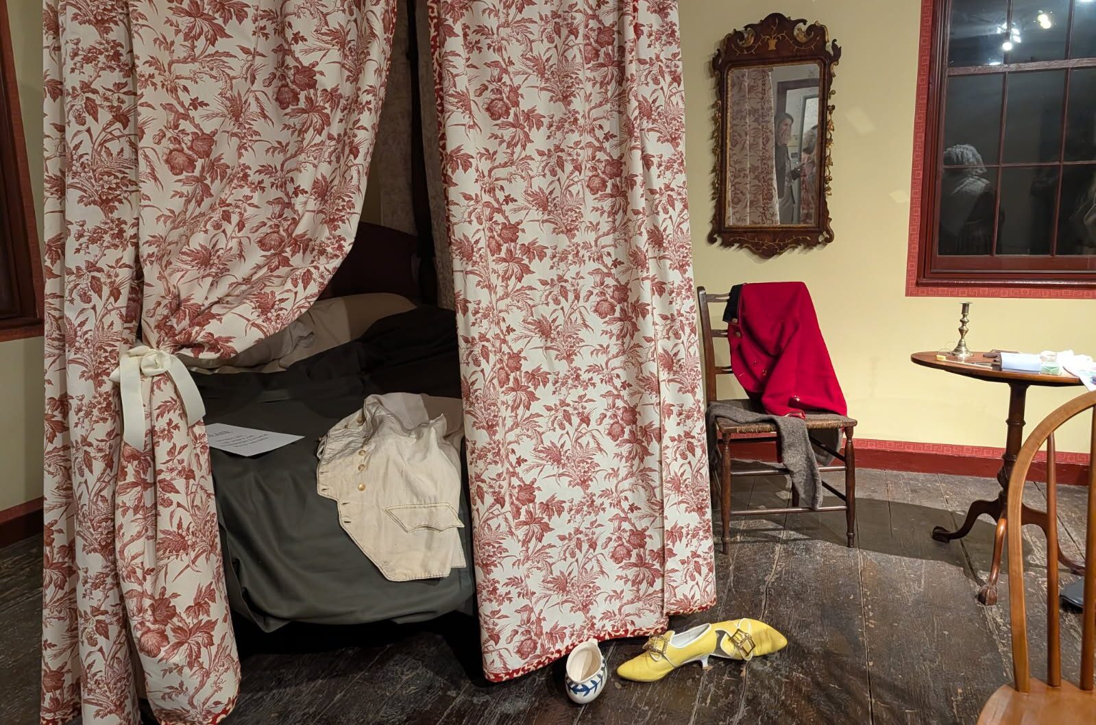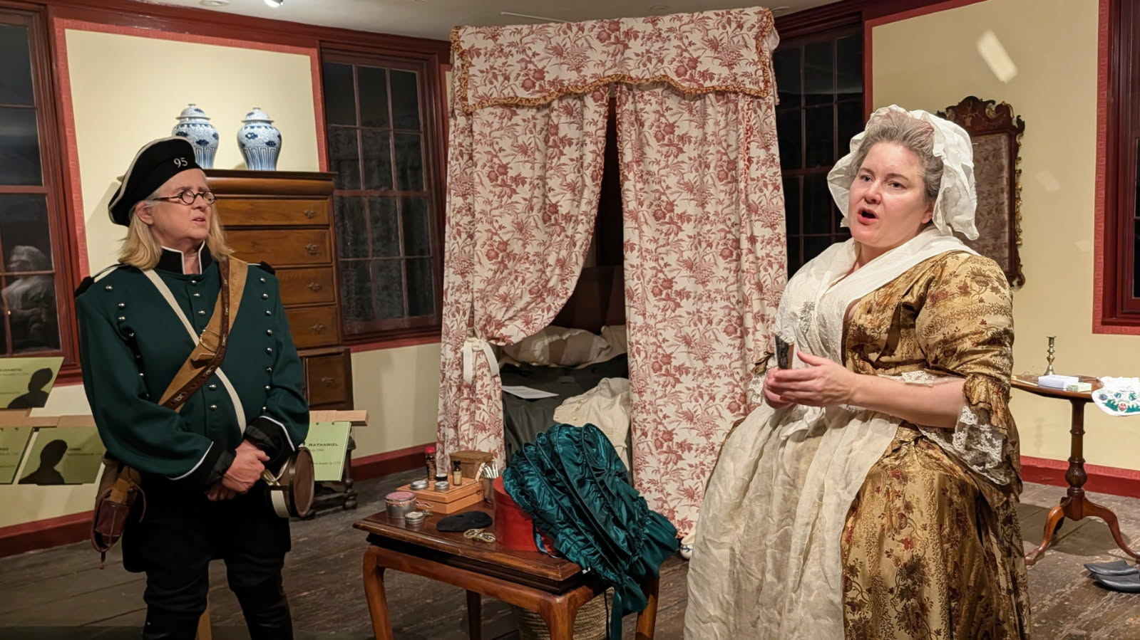 An upstairs bedroom was set up as a brothel scene for “Naughty Newton at Night” at the Durant-Kenrick House on April 11, 2026. Photo by Bryan McGonigle
