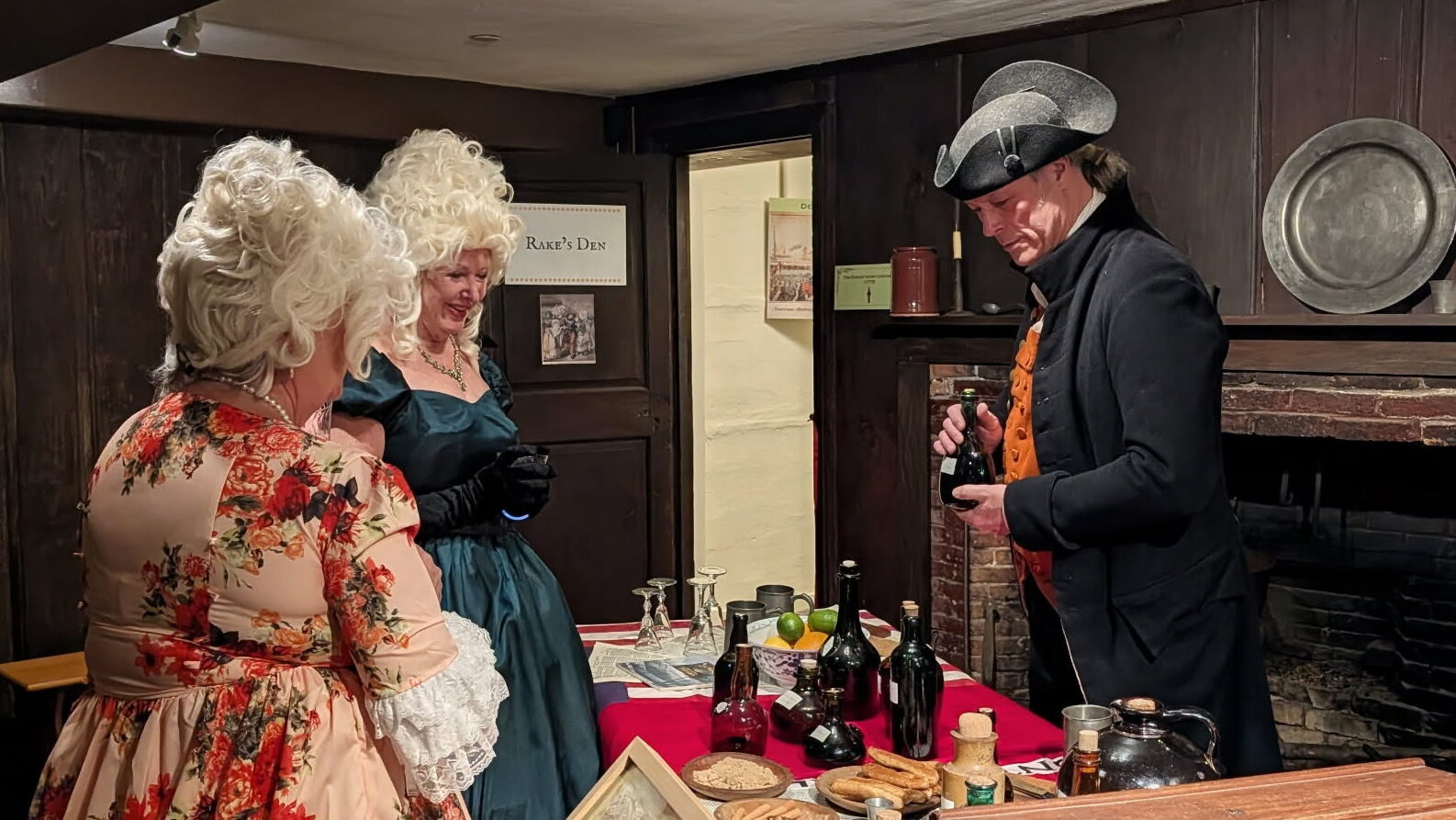 A reenactor shows guests various liquors enjoyed by Americans in the 18th century. Photo by Bryan McGonigle