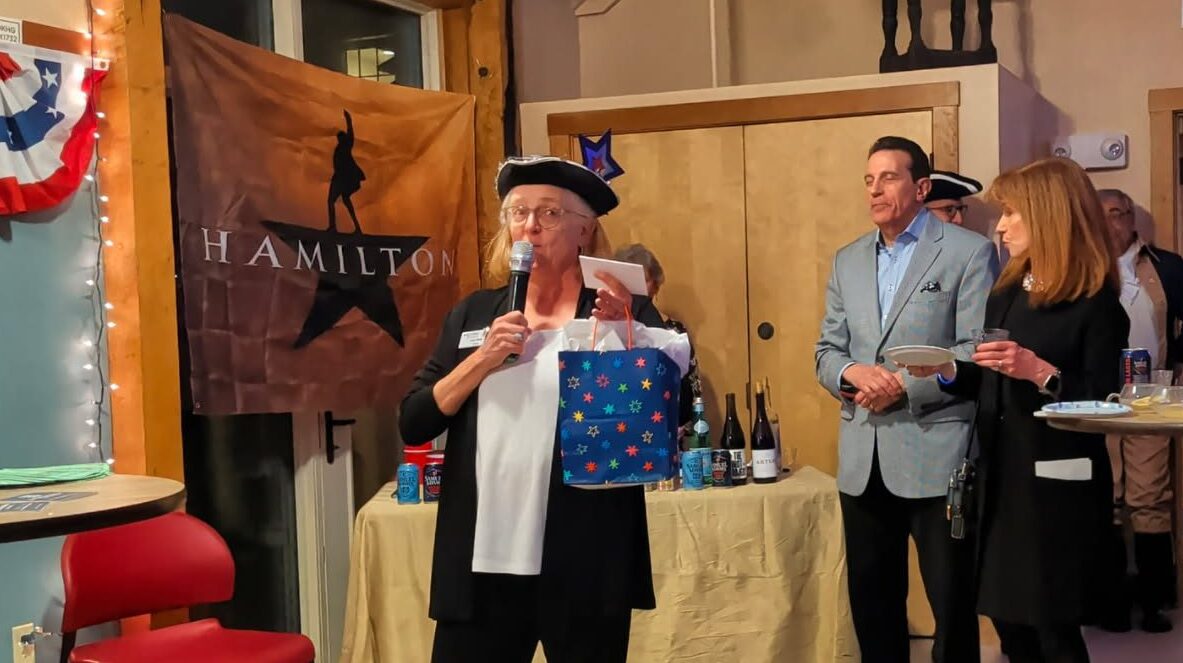 Historic Newton Director Lisa Dady hands out prizes at “Naughty Newton at Night” at the Durant-Kenrick House on April 11, 2026. Photo by Bryan McGonigle