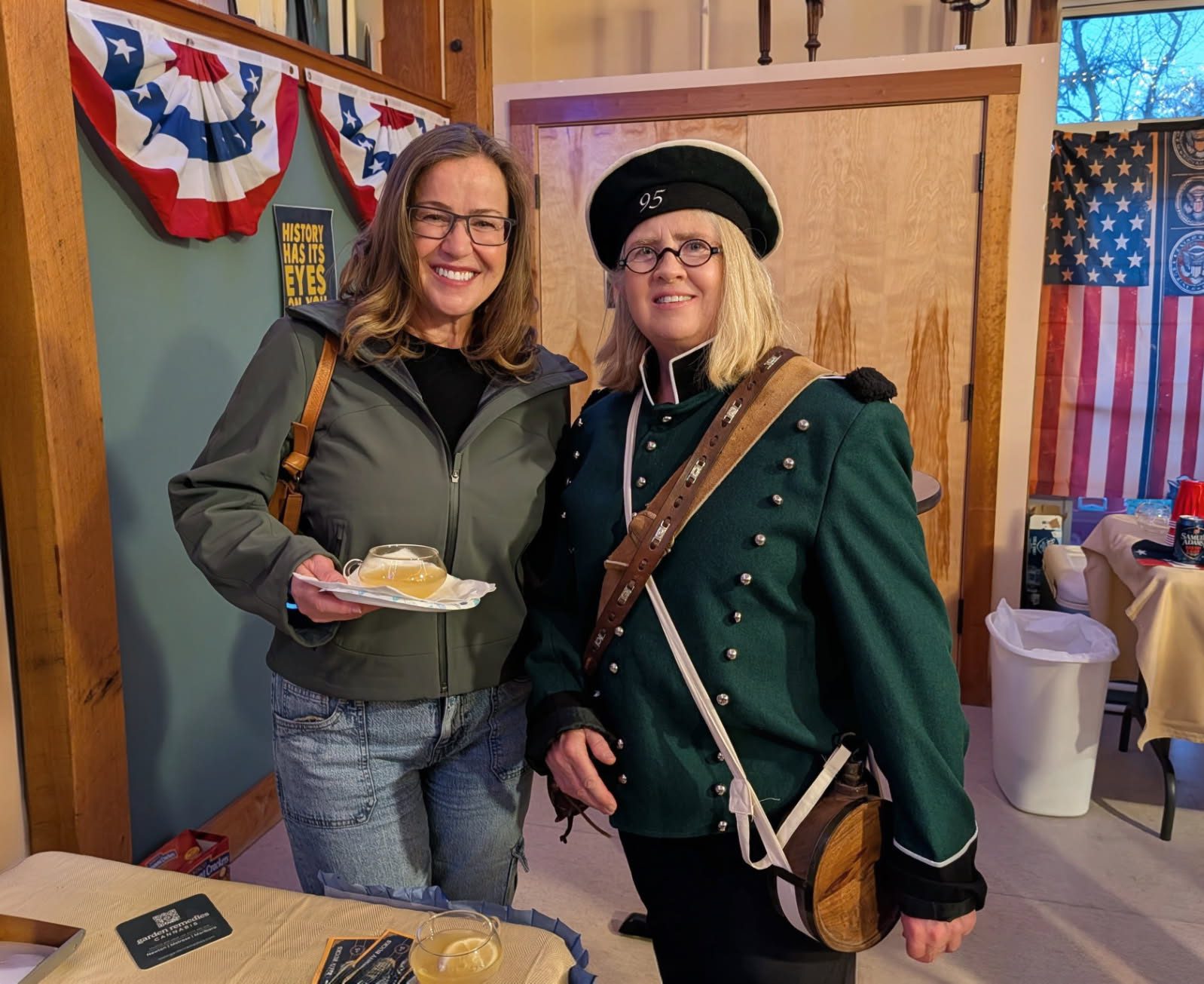 Renee Walker-Tuttle, historical reenactor, seen here with City Councilor Alison Leary, talks about sex work in the 18th century at at “Naughty Newton at Night” at the Durant-Kenrick House on April 11, 2026. Photo by Bryan McGonigle