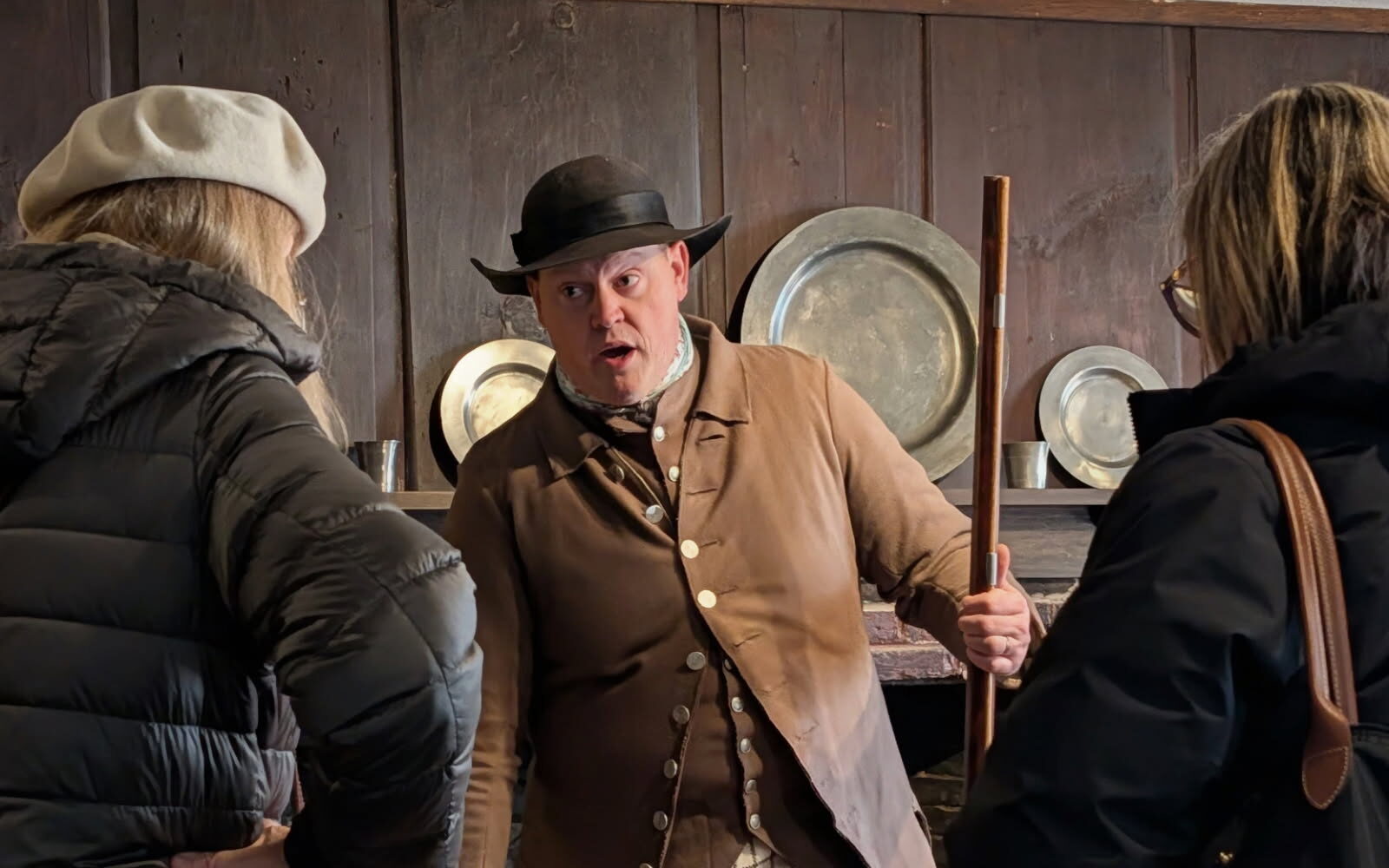 A reenactor talks with guests at the Durant Kenrick House on March 30, 2026. Photo by Bryan McGonigle