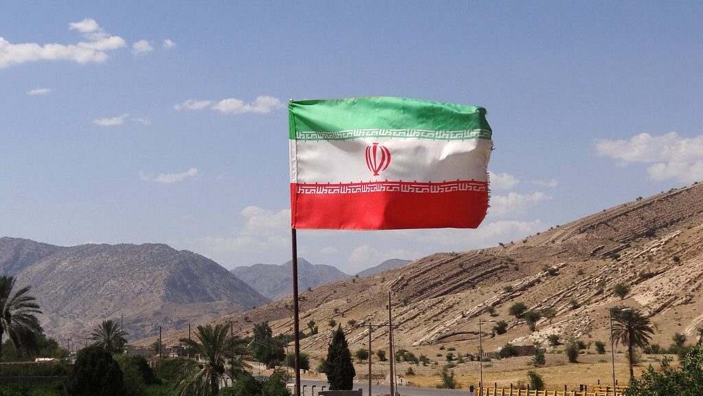 Iranian flag flying above an archeological site in southern Iran. Public domain photo