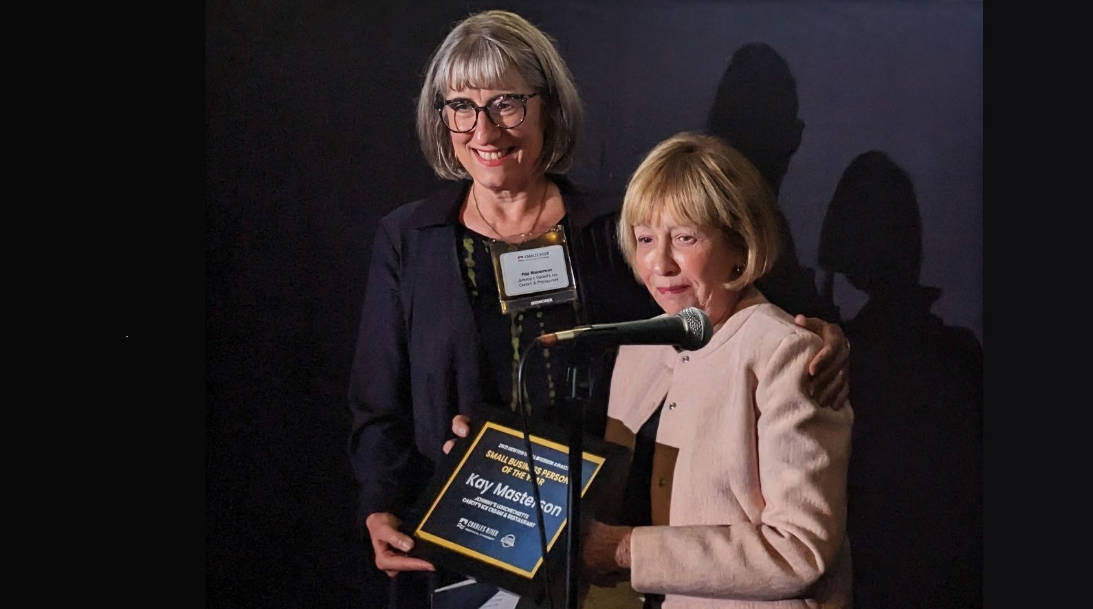 Kay Masterson, owner of Cabot’s Ice Cream and Johnny’s Luncheonette, shown here with State Sen. Cindy Creem, was named Small Businessperson of the Year at the Charles River Chamber’s Newton Small Business Awards on Sept. 12, 2025. Photo by Bryan McGonigle