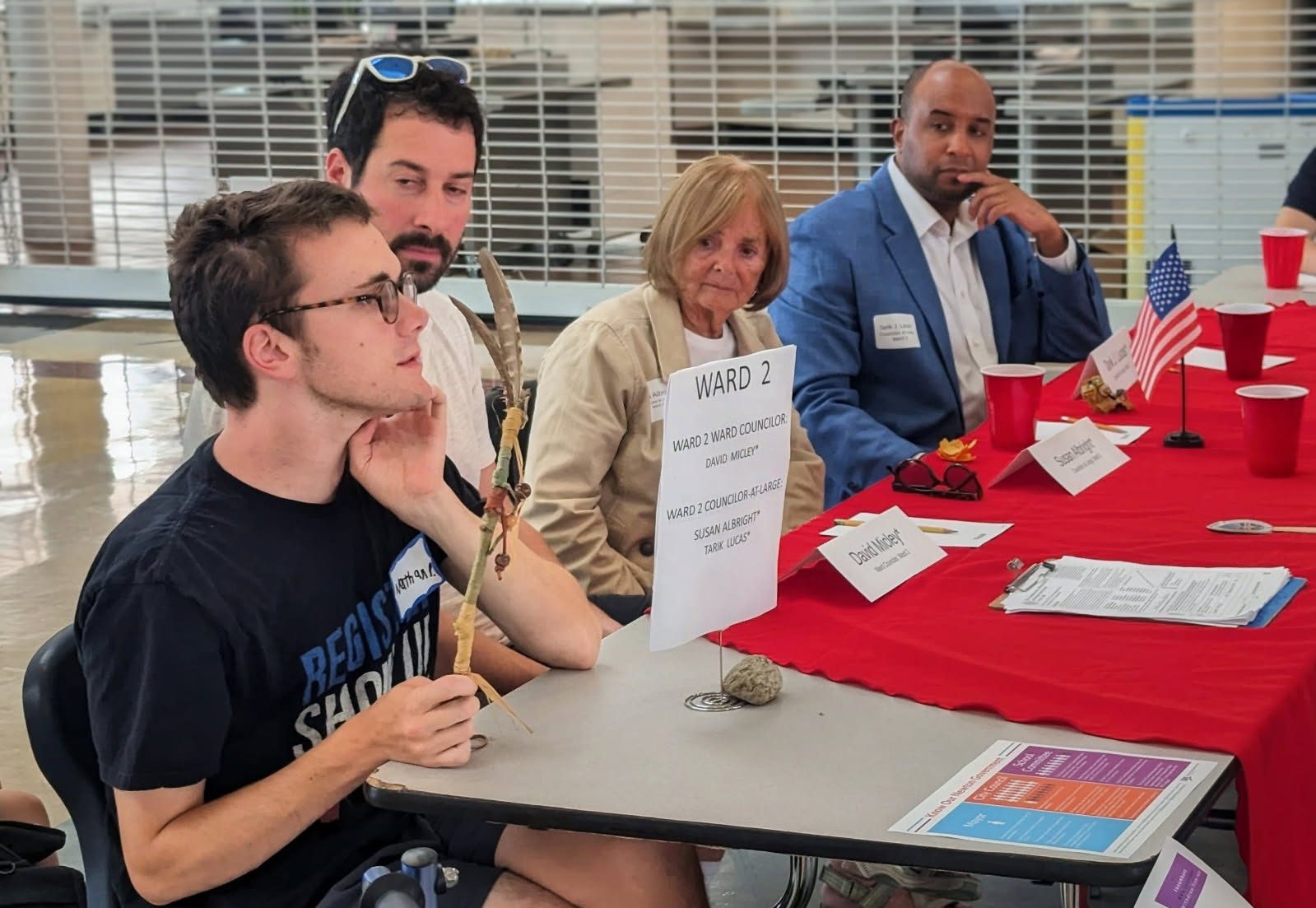 Left to right: Nathan Persampieri, holding the Ward 2 table's "talking stick," asks questions while city councilors David Micley, Susan Albright and Tarik Lucas listen at the League of Women Voters' Afternoon at the Races event on Oct. 4. Photo by Bryan McGonigle