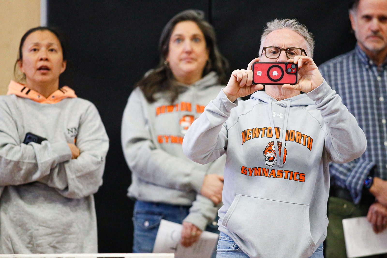Newton North parents watched a gymnast compete on the uneven bars. (c) Burt Granofsky/Newton Beacon