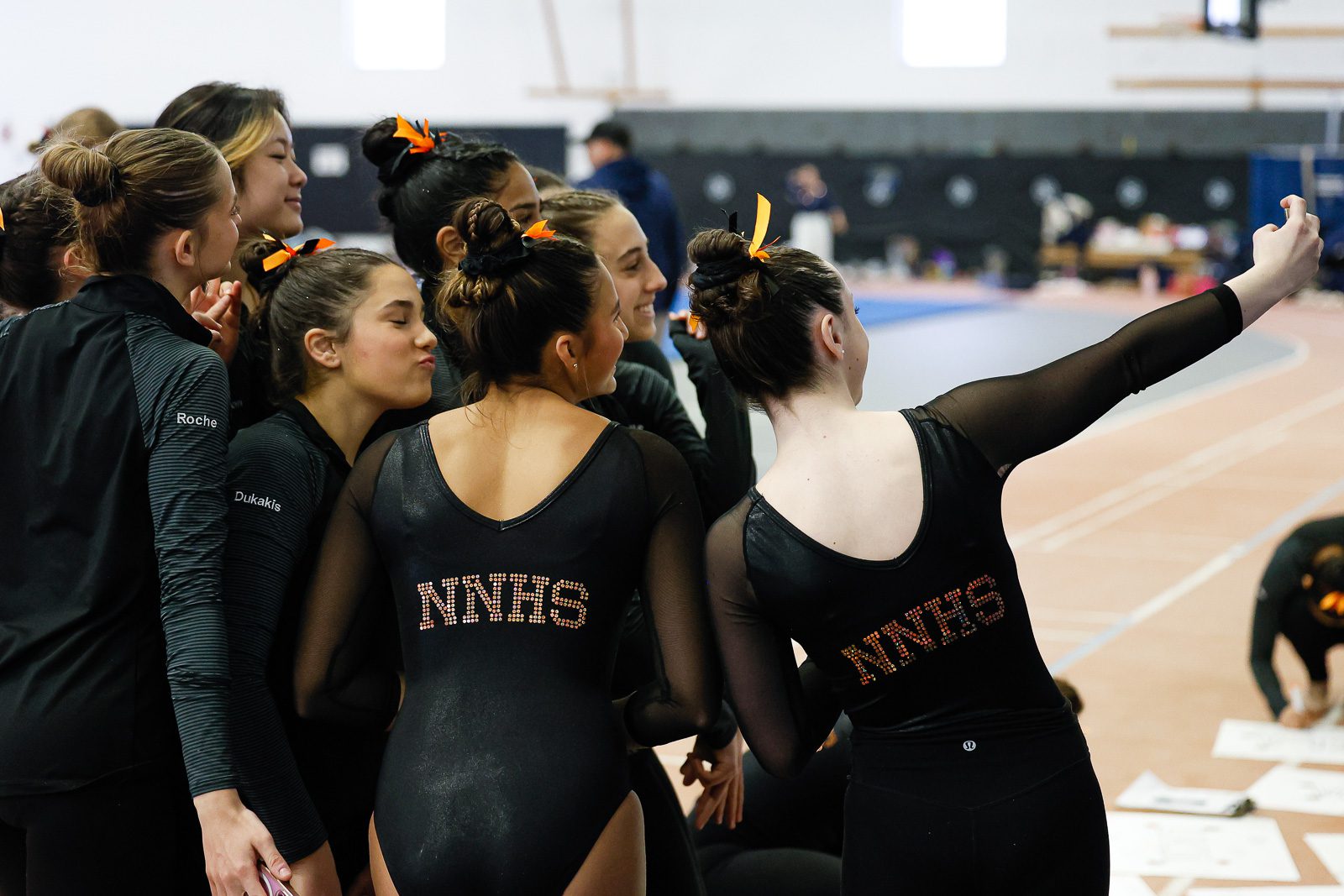 The Newton North gymnastics team takes a selfie ahead of the Bay States Conference Championships at Newton North on February 7, 2026. (c) Burt Granofsky/Newton Beacon