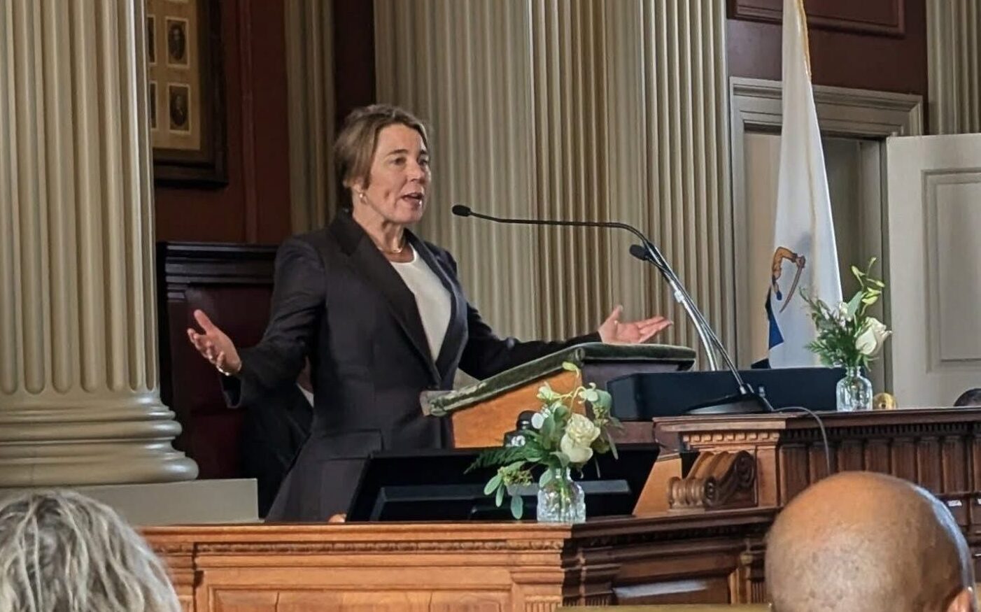 Gov. Maura Healey speaks at Newton’s 2026 Inauguration ceremony on Jan. 1, 2026. Photo by Bryan McGonigle