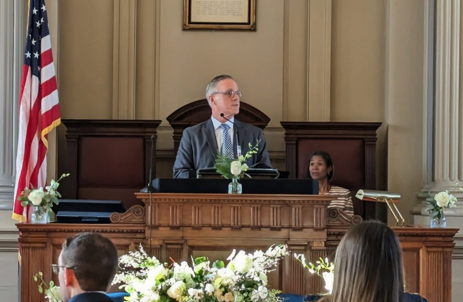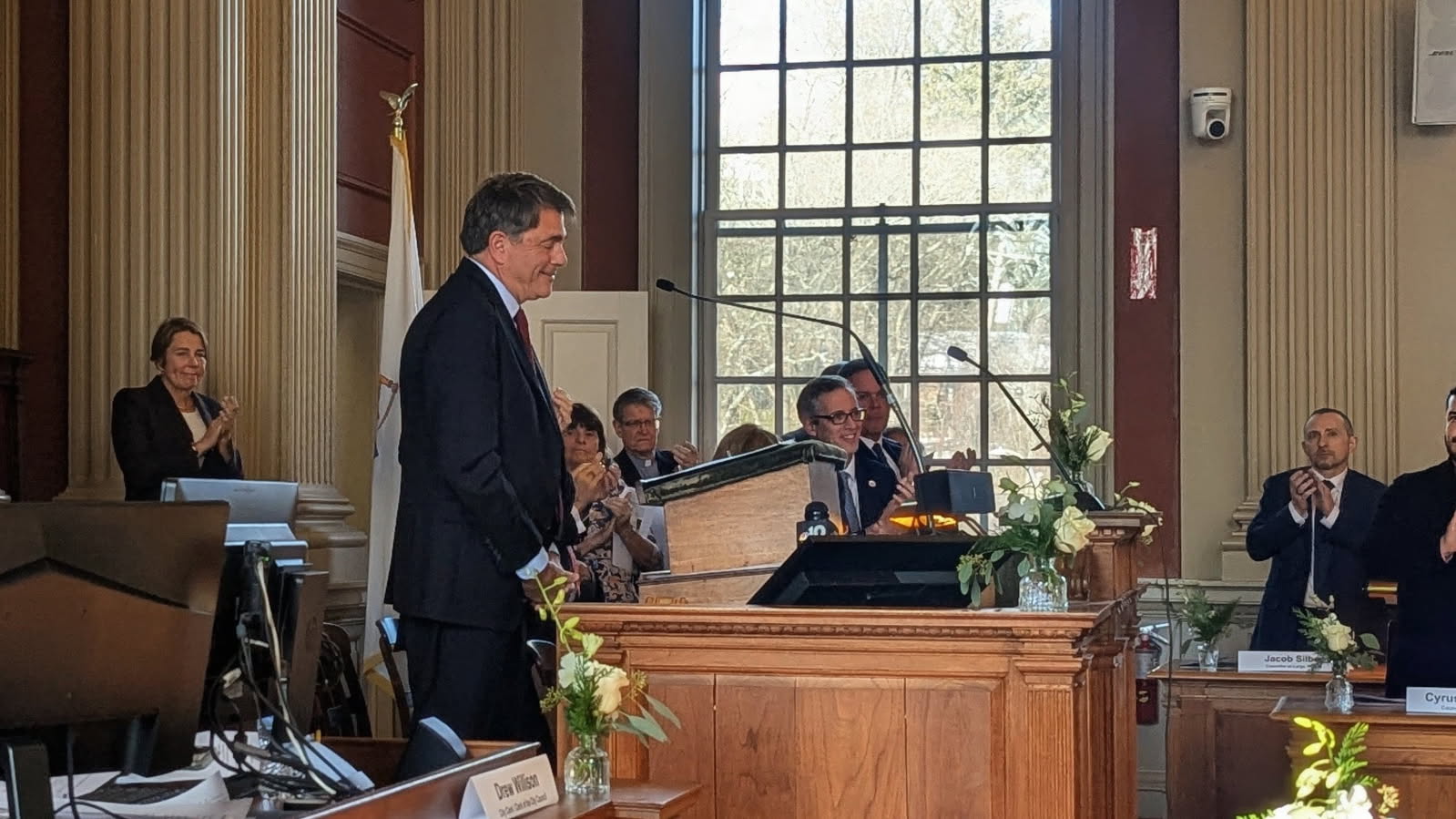 “So as you embark on the enterprise of governing Newton, please bear in mind the historic significance of what you’re doing,” Budd said. “You’re not only making decisions about our schools, our zoning, our roads and other public amenities, you are carrying on the great tradition of local government, self-government, that helped to forge the foundation of our nation.”