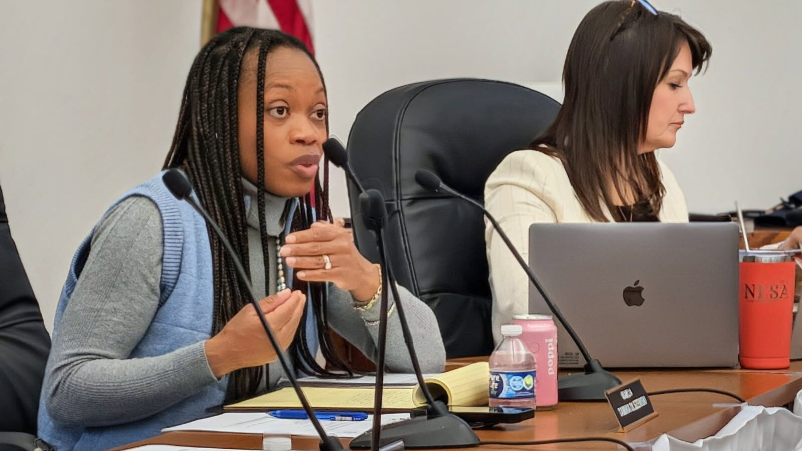 School Committee member Tamika Olszewski, shown here with Superintendent Anna Nolin, speaks after a budget presentation on March 30, 2026. Photo by Bryan McGonigle