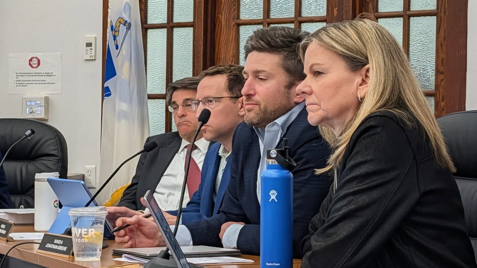 Mayor Marc Laredo and School Committee members Ben Schlesinger, Jonathan Greene and Linda Swain listen to public comment on March 30, 2027. Photo by Bryan McGonigle