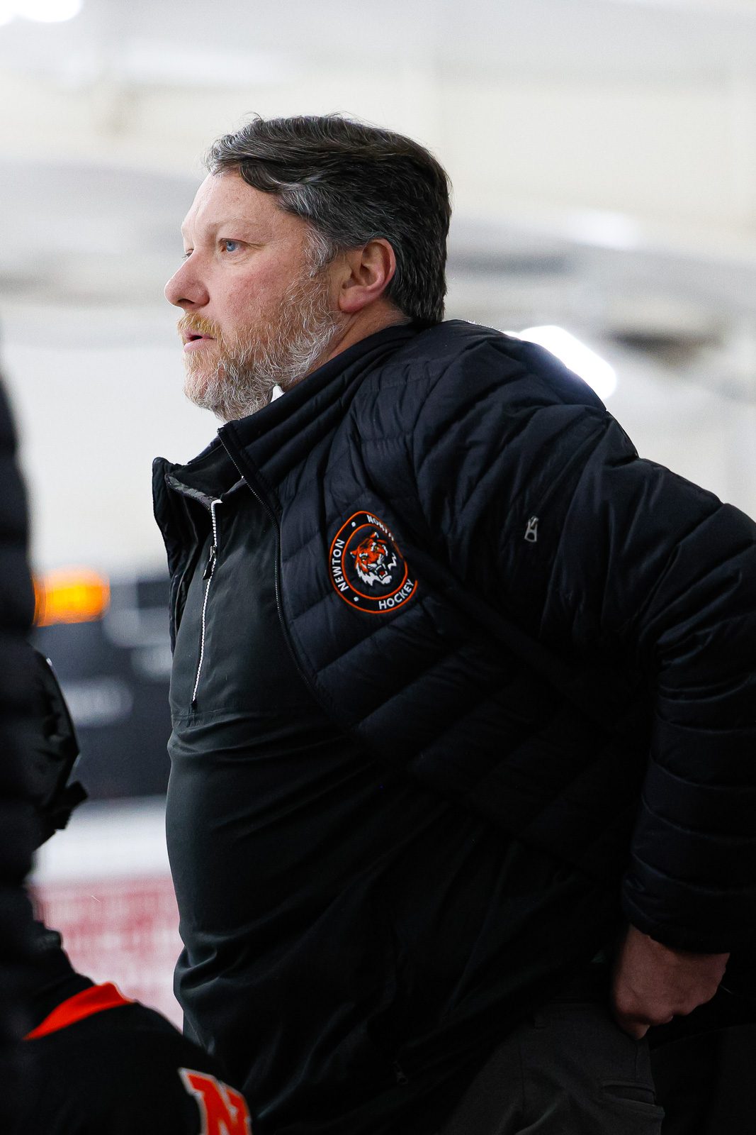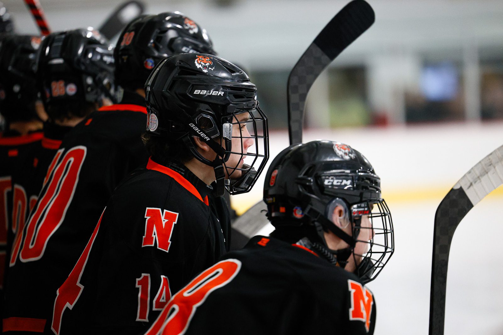 Rowan Fine (14) watches a shift from the Tigers bench. (c) Burt Granofsky/Newton Beacon