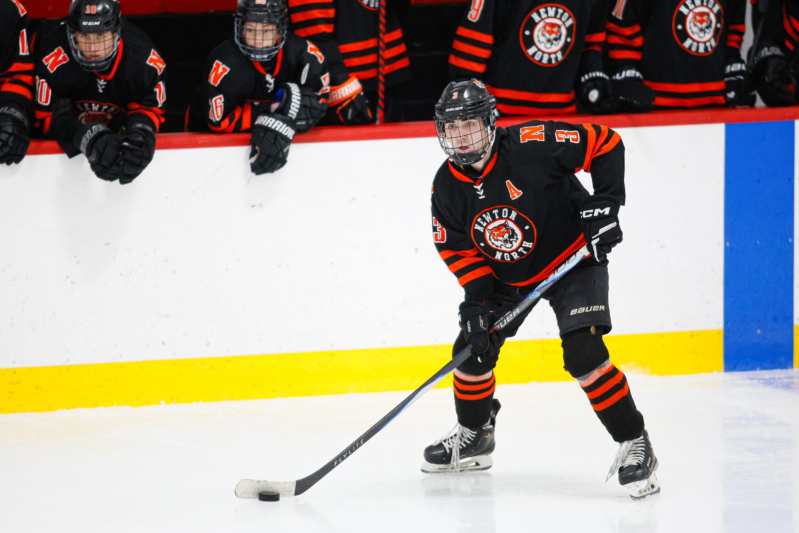 Tyler Bubanas-McCarthy (3) holds the puck in front of his bench. (c) Burt Granofsky/Newton Beacon