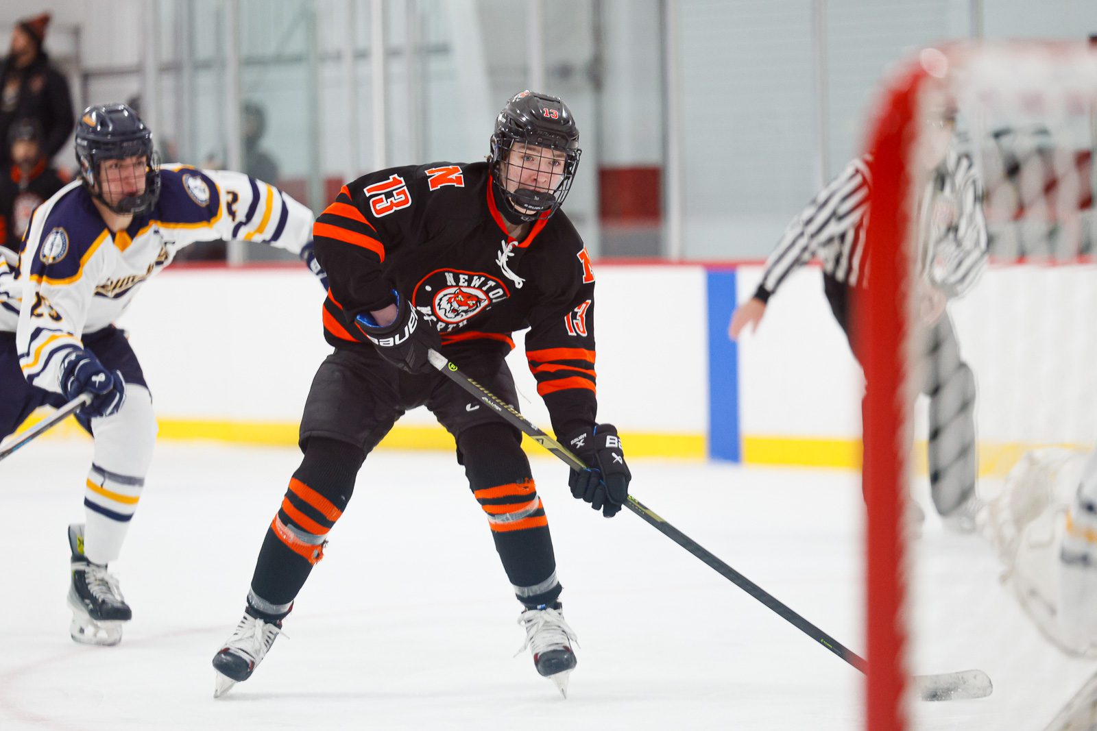 Gus Wallask (13) lines up a shot. The Tigers found themselves down 2-0 early in the first period and never found a way to close the gap against Lexington. (c) Burt Granofsky/Newton Beacon