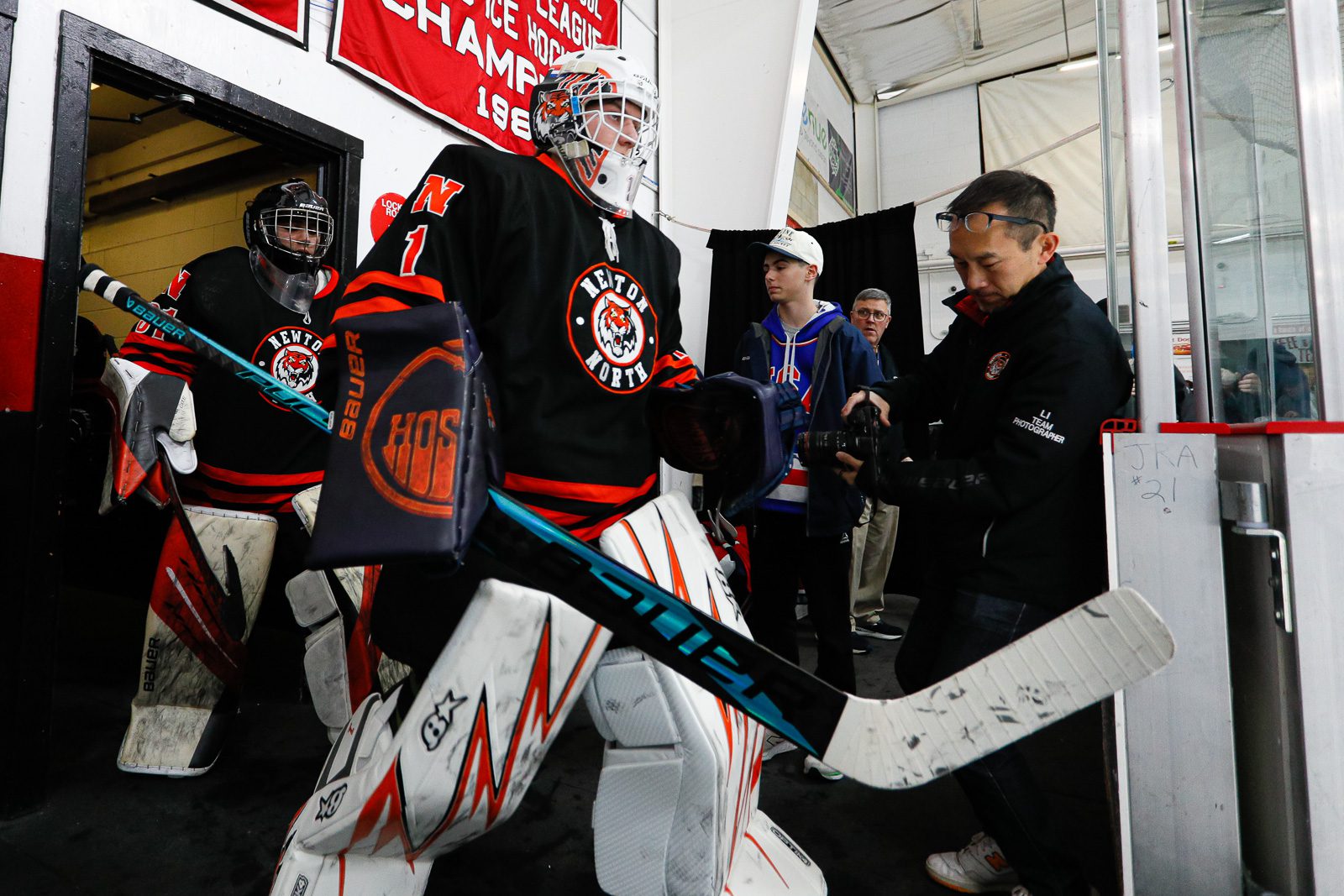 Goaltender Djaden Terwal (1) leads the Newton North Tigers boys hockey team out of the locker room. (c) Burt Granofsky/Newton Beacon