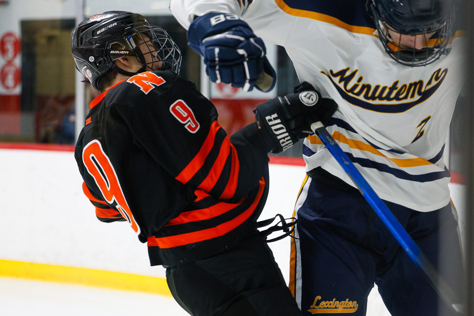 The Lexington Minutemen frustrated Christian Cerone (16) and the Newton North Tigers all game, en route to handing the Tigers a 3-0 loss in the consolation game of the Travis Roy Junior Beanpot Tournament at the John A. Ryan Skating Arena in Watertown on January 17, 2026. (c) Burt Granofsky/Newton Beacon