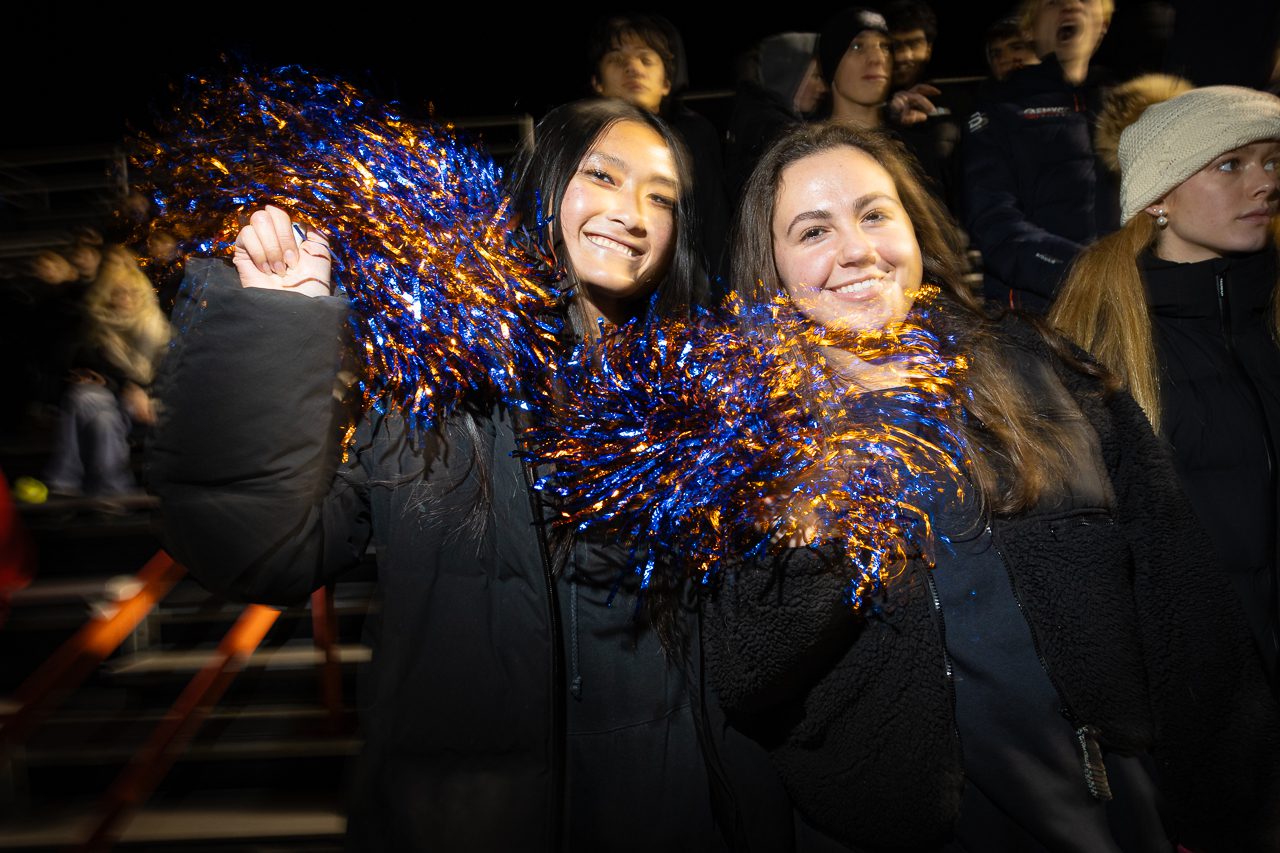 Two Newton South fans wave blue and orange pom-poms during halftime. (c) Burt Granofsky/Newton Beacon