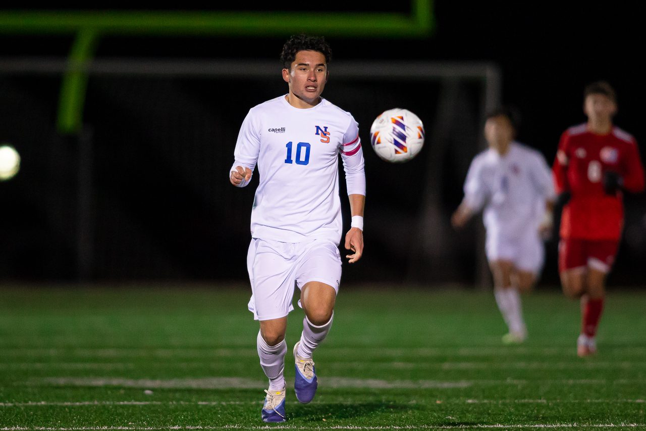 Ronen Heimlich (10) and the rest of the Newton South offense attacked often but couldn’t break through in the second half, ultimately falling to Natick 2-0. (c) Burt Granofsky/Newton Beacon