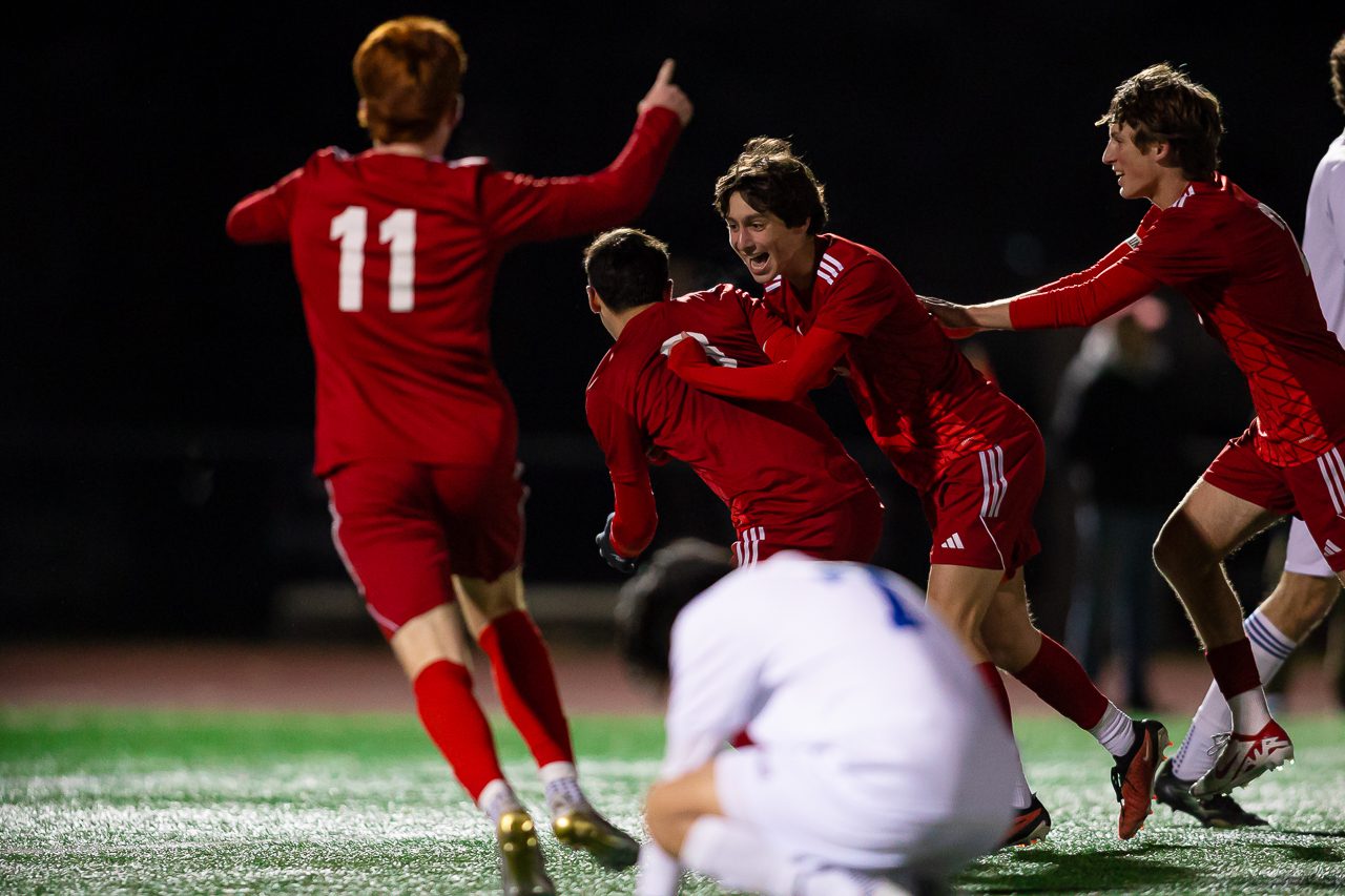 Natick players celebrate a second and decisive goal to defeat Newton South in the MIAA Division 1 boys soccer tournament at Woburn HS on November 18, 2025. (c) Burt Granofsky/Newton Beacon