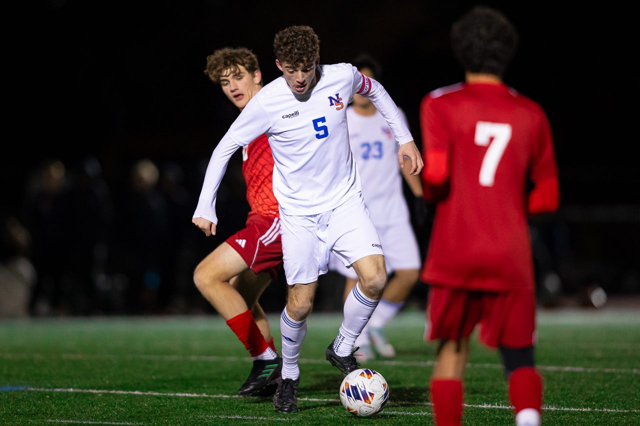 Newton South’s Oliver Helmling (5) keeps possession in the second half. Down 1-0 at halftime, Newton South couldn’t unlock Natick’s defense, ultimately falling 2-0. (c) Burt Granofsky/Newton Beacon