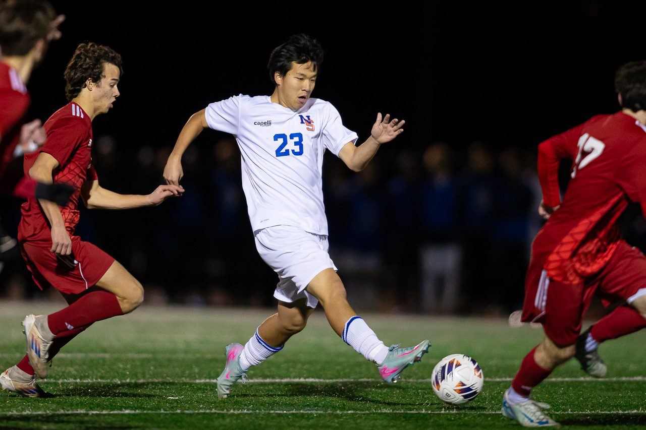Matteo Lee (13) drives the ball forward. (c) Burt Granofsky/Newton Beacon