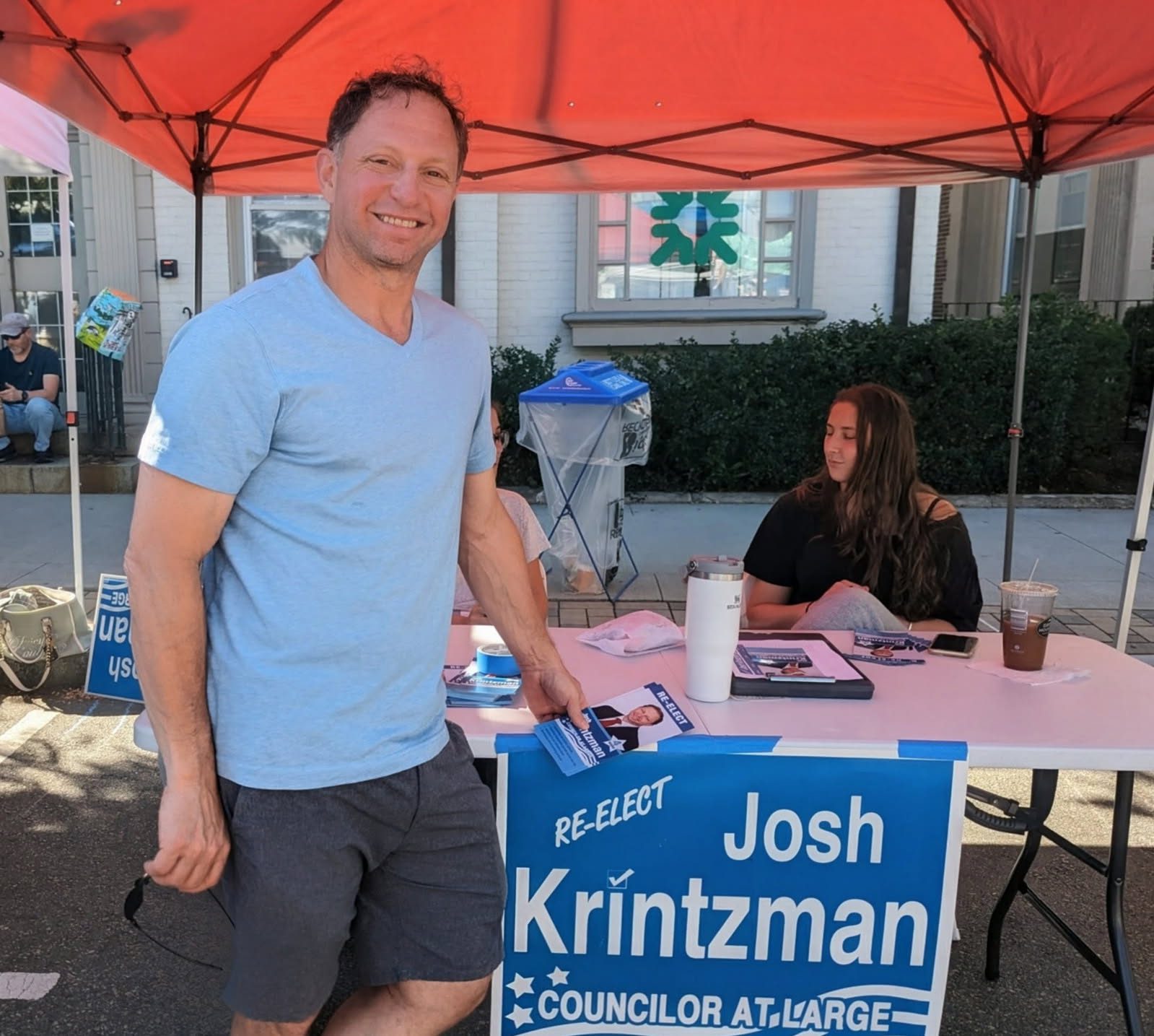City Councilor Josh Krintzman works his booth at Newtonville’s Village Day on Oct. 5, 2025. Photo by Bryan McGonigle
