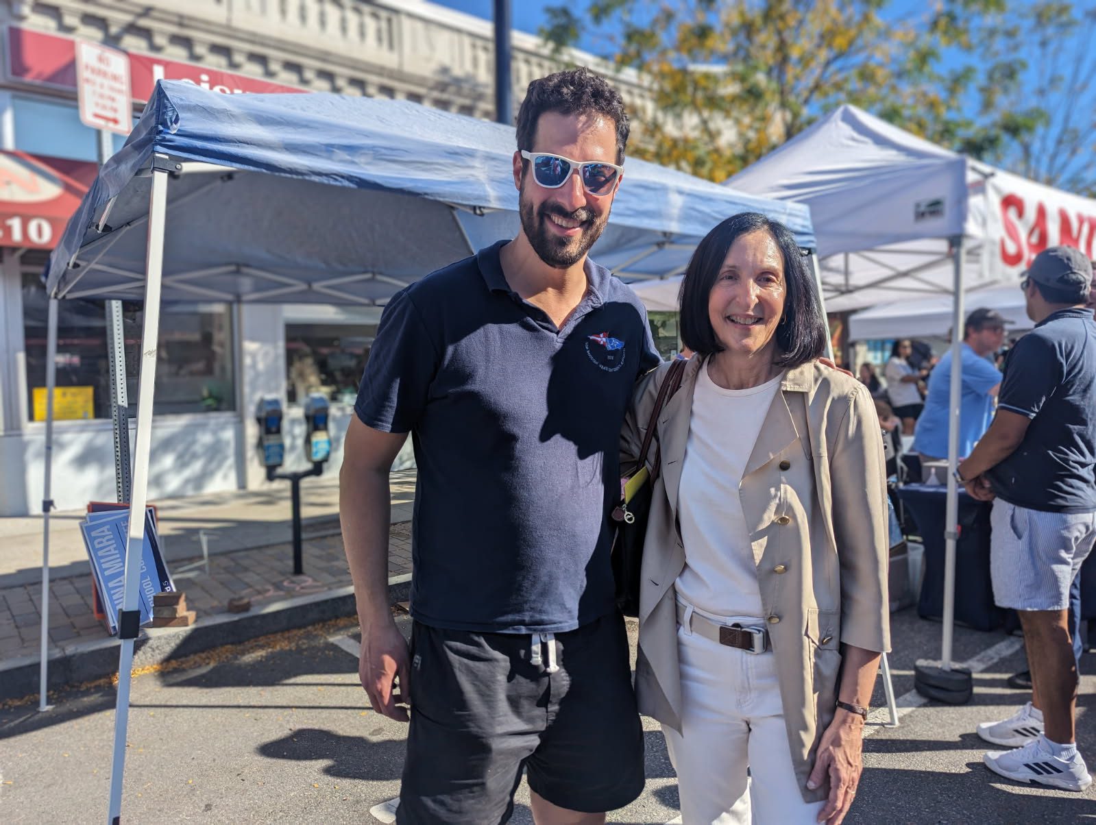 Sue Cohen of NPS, left, and School Committee candidate Mali Brodt, right, engage with voters at Newton’s Village Day on Oct. 5, 2025. Photo by Bryan McGonigle