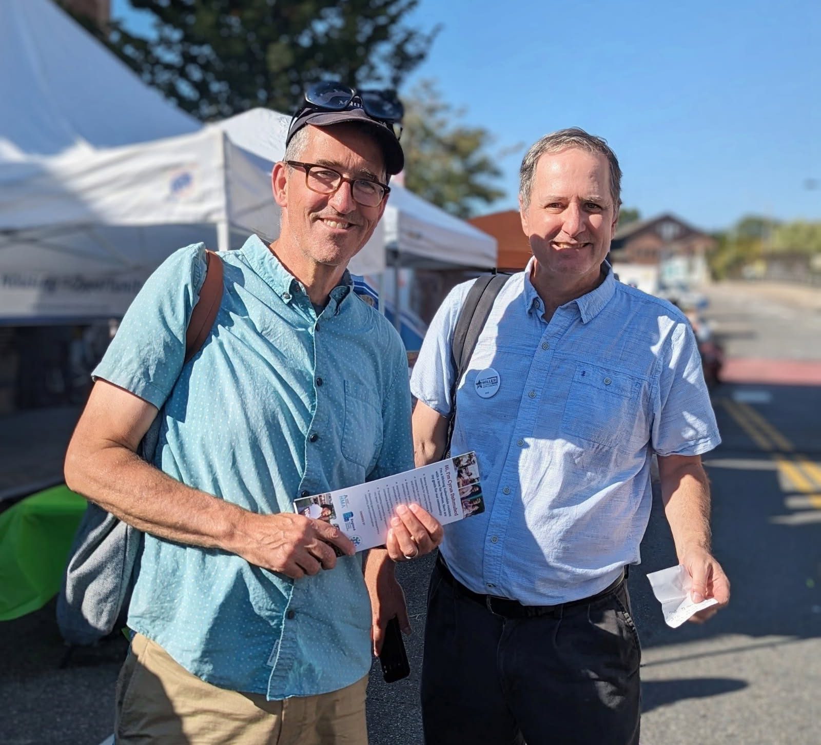 City Council candidates Sean Roche, left, and Garry Miller, right, attend Newton’s Village Day on Oct. 5, 2025. Photo by Bryan McGonigle