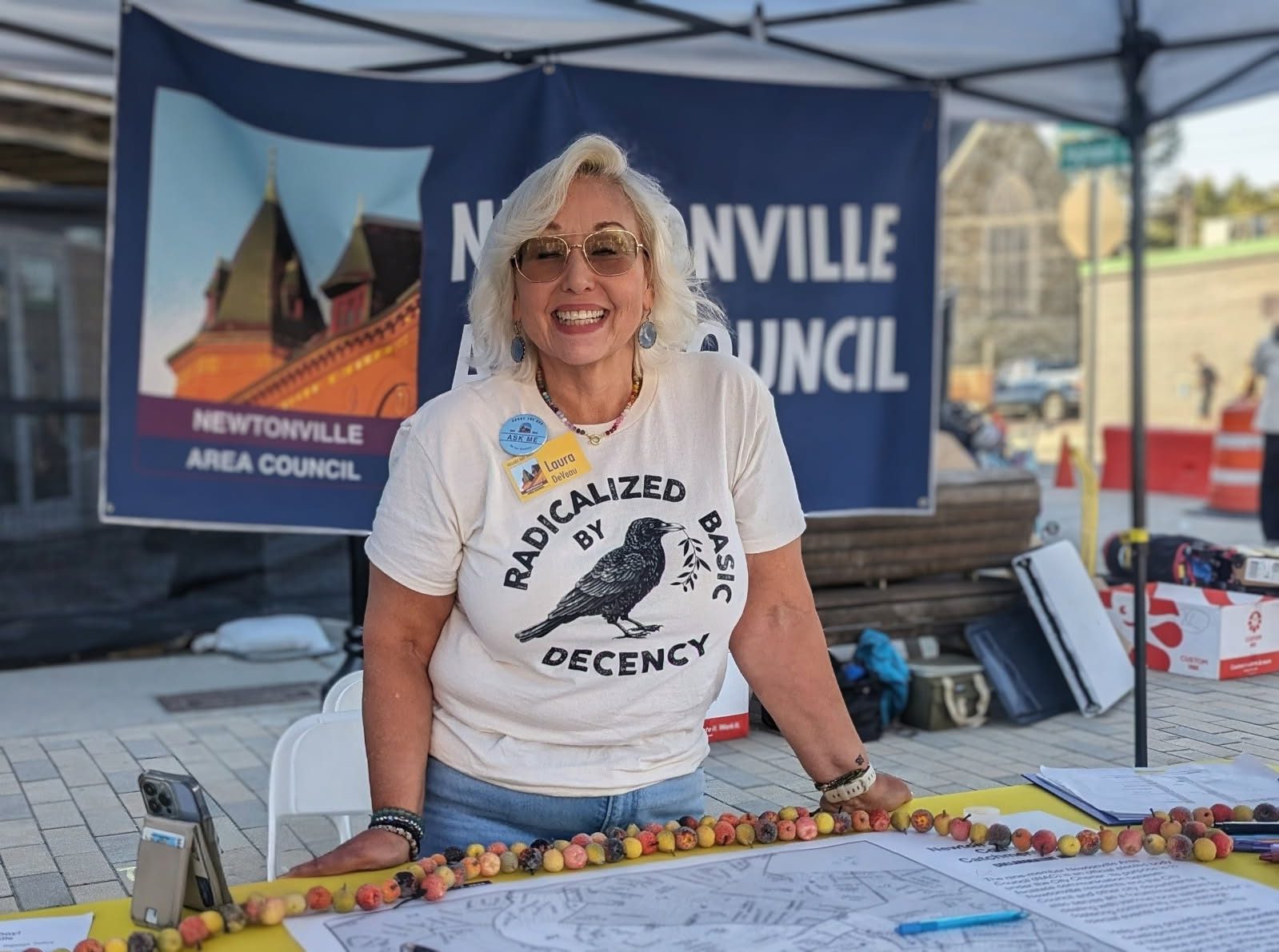 Laura DeVeau of the Newtonville Area Council welcomes visitors to Newton’s Village Day on Oct. 5, 2025. Photo by Bryan McGonigle