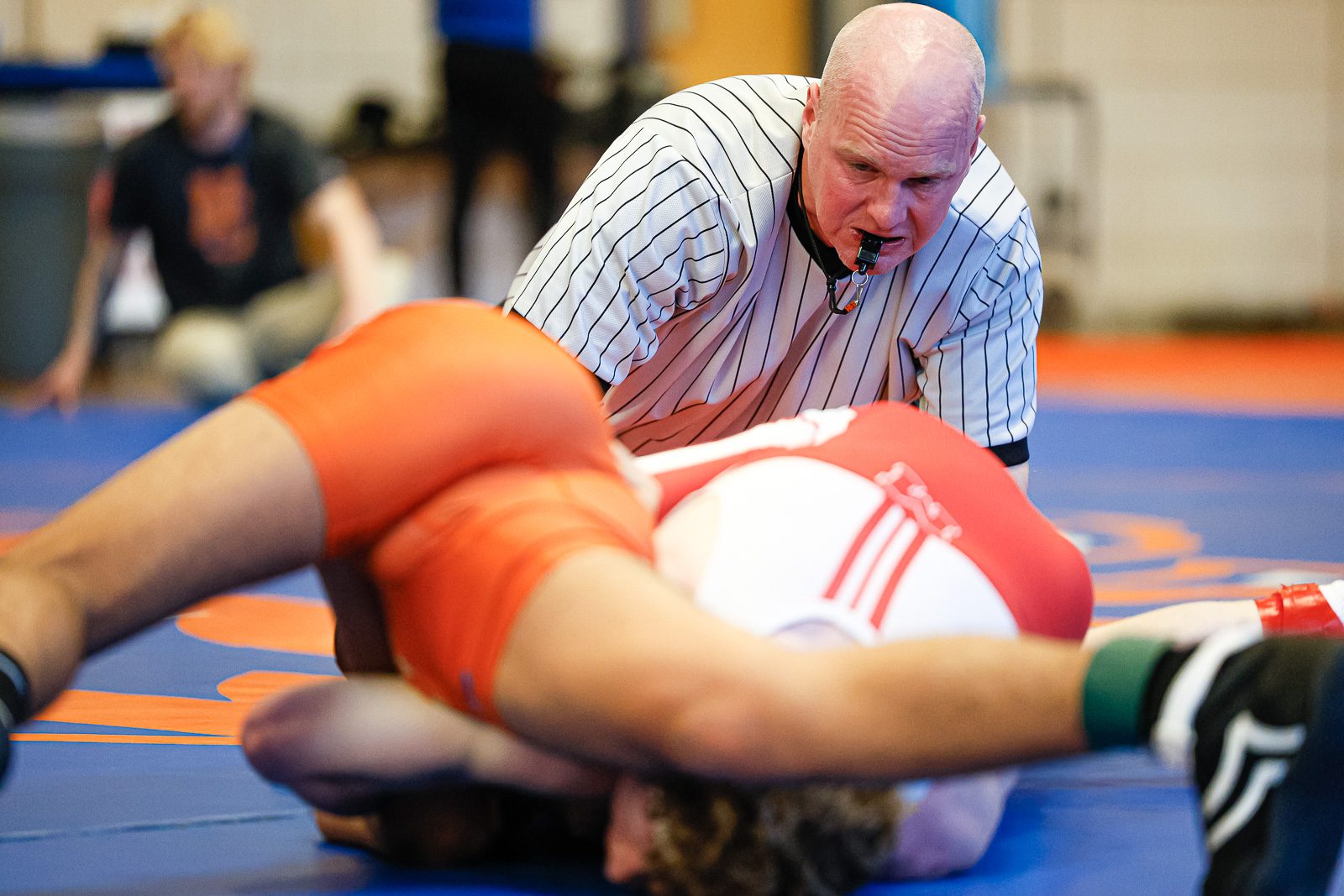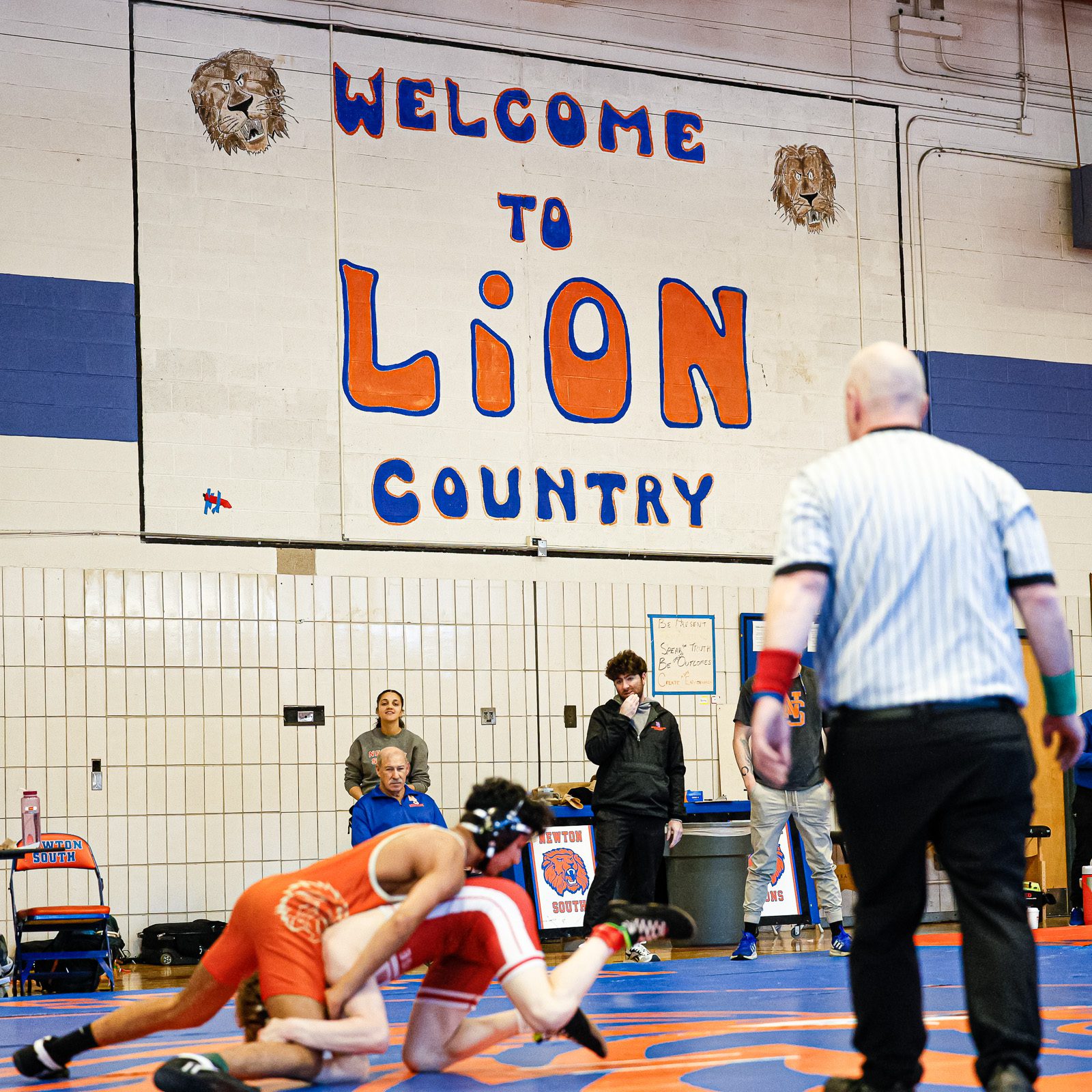 A referee watches the action during a quad meet at Newton South on January 24, 2026. (c) Burt Granofsky/Newton Beacon