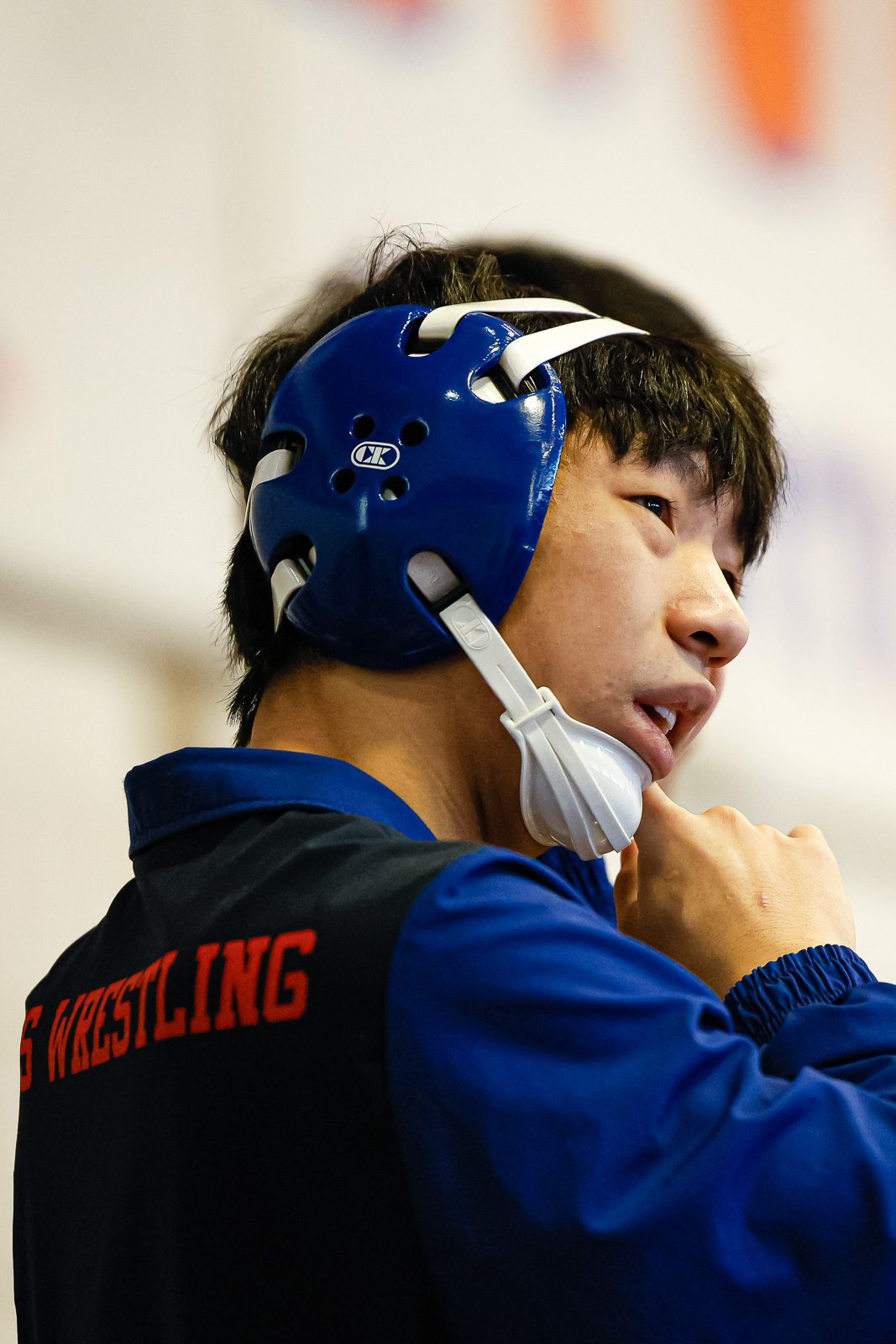 Alex Brady fastens his headgear. (c) Burt Granofsky/Newton Beacon