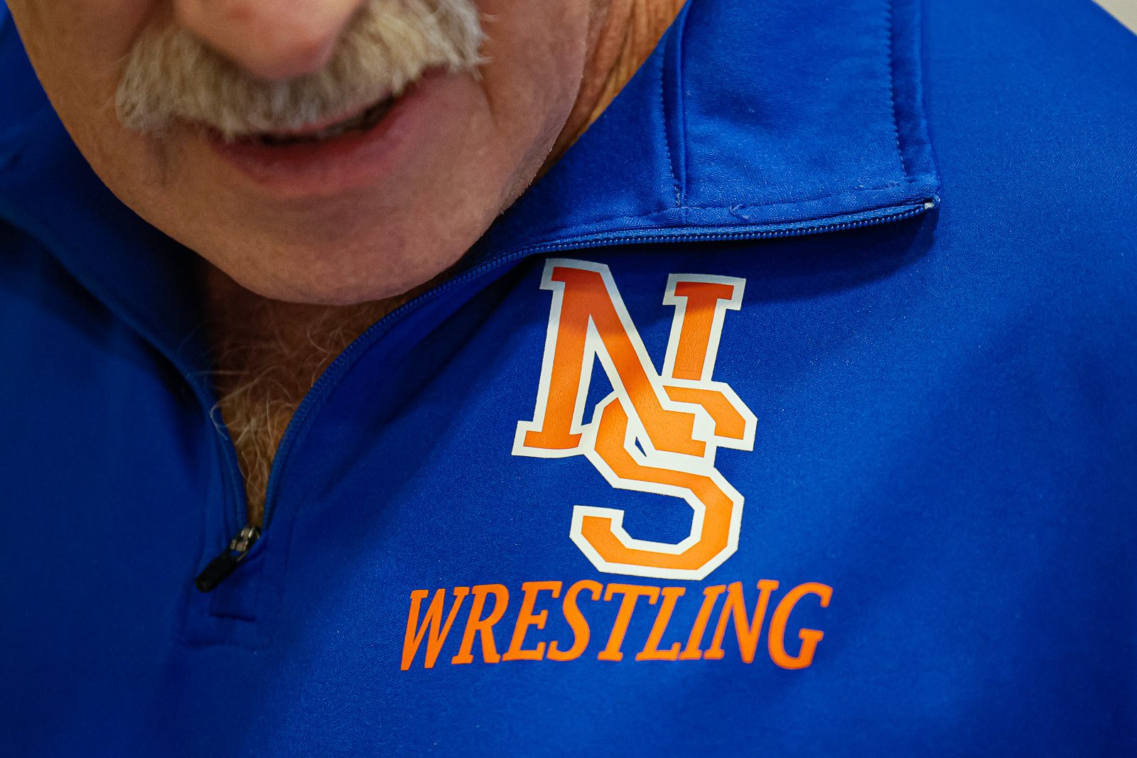 Coach Bill Fagen wears a Newton South wrestling shirt. (c) Burt Granofsky/Newton Beacon