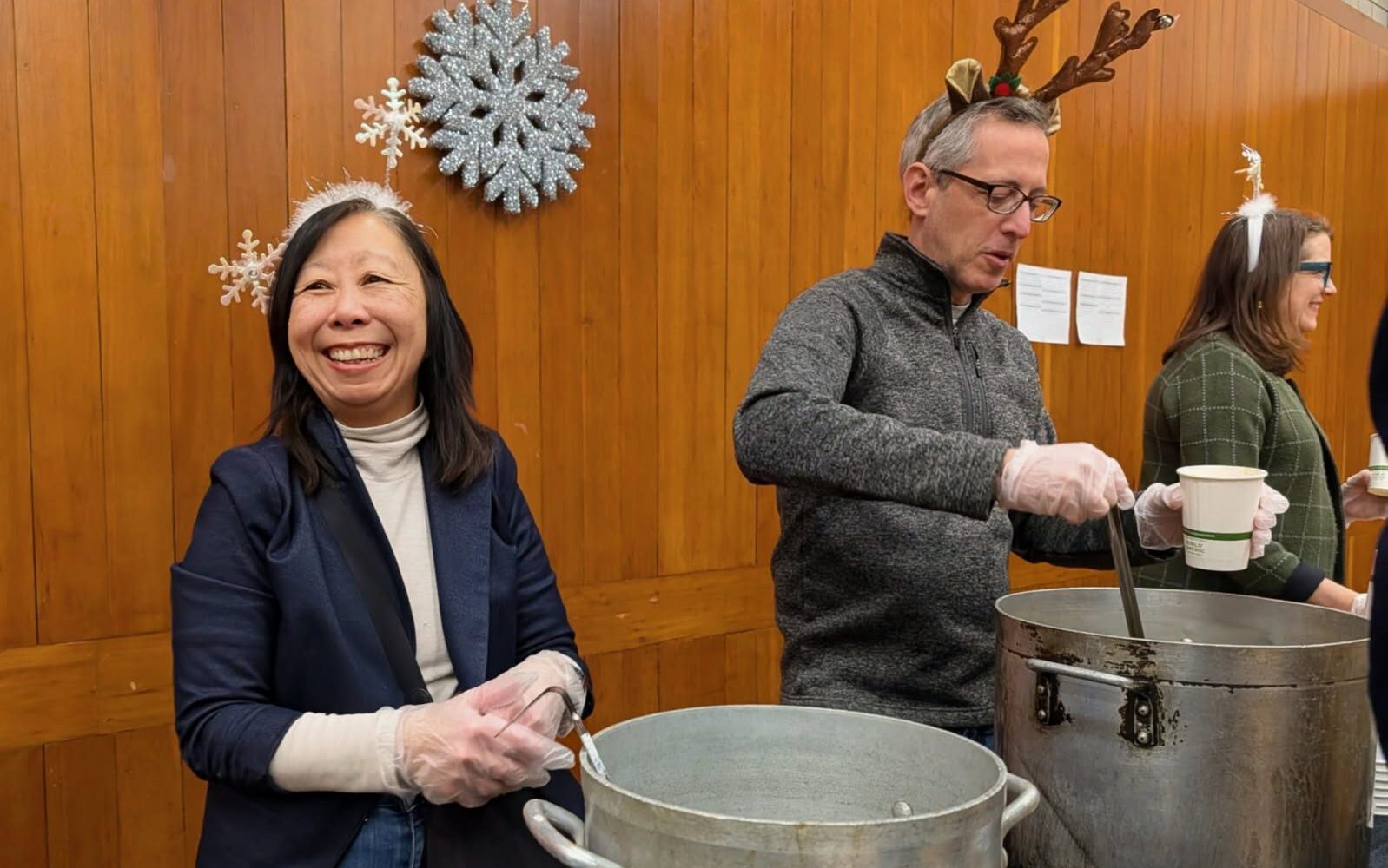 City Councilor Julie Irish, shown here with State Rep. Greg Schwartz and Mayor Marc Laredo, doles out soup at the WinterFEST Soup Social at the Hyde Community Center on Jan. 24, 2026. Photo by Bryan McGonigle