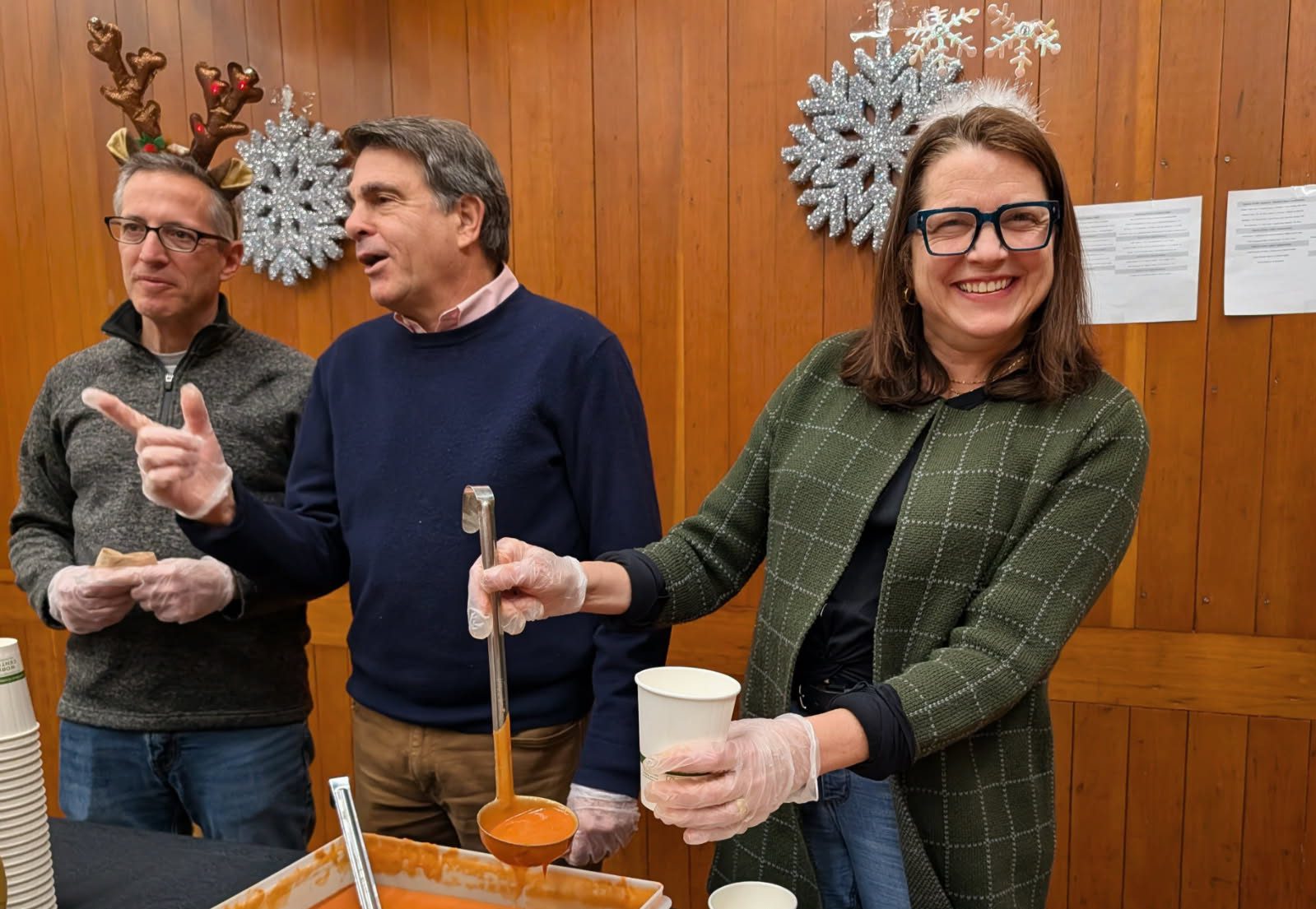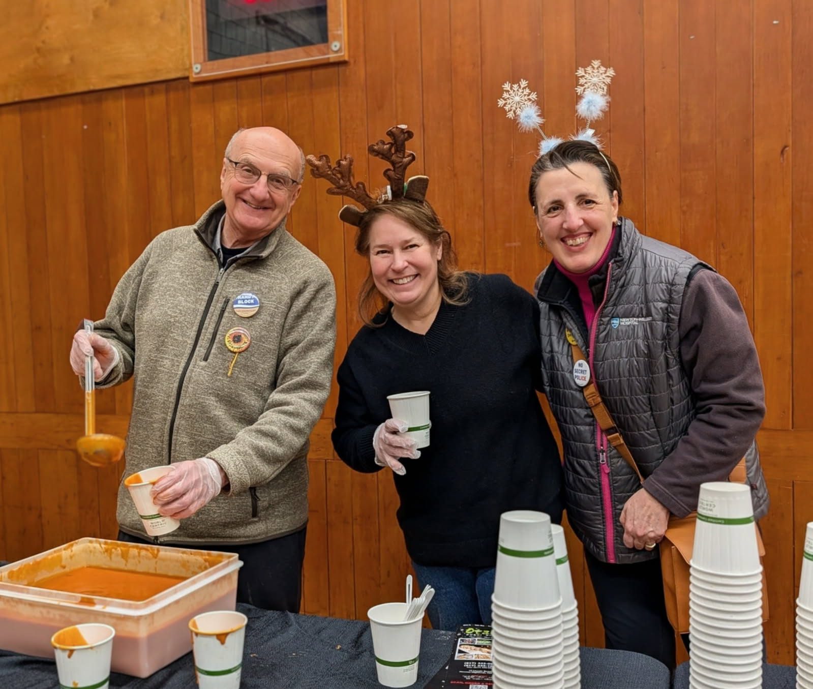 Left to right: City Councilors Randy Block, Lisa Gordon and Maria Greenberg dish out soup at the WinterFEST Soup Social at the Hyde Community Center on Jan. 24, 2026. Photo by Bryan McGonigle