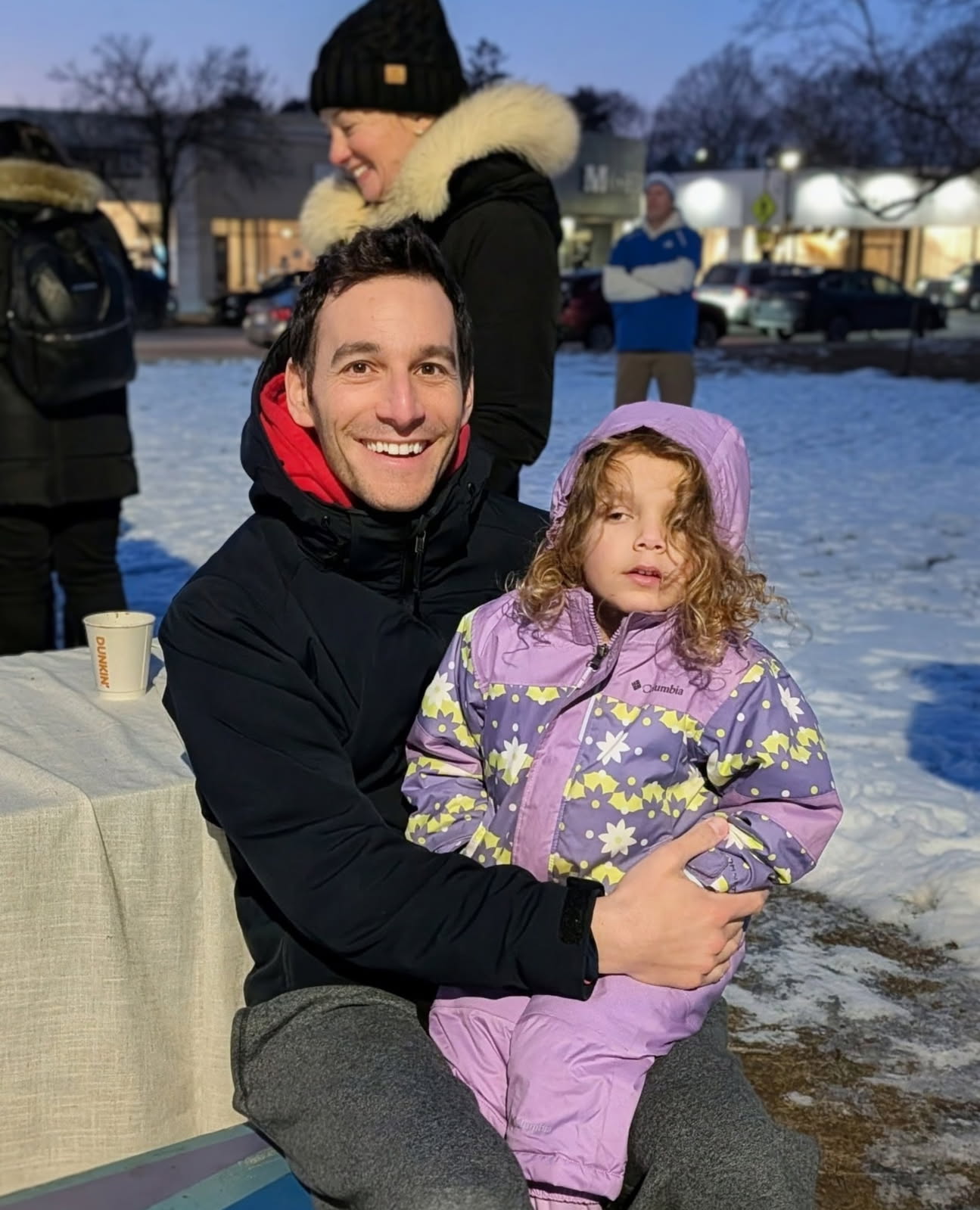 Dan Gaynor of Newtonville and his daughter, Poppy, enjoy the opening night of Spark Newton’s 2026 WinterFEST in Newton Centre on Jan. 23, 2026. Photo by Bryan McGonigle