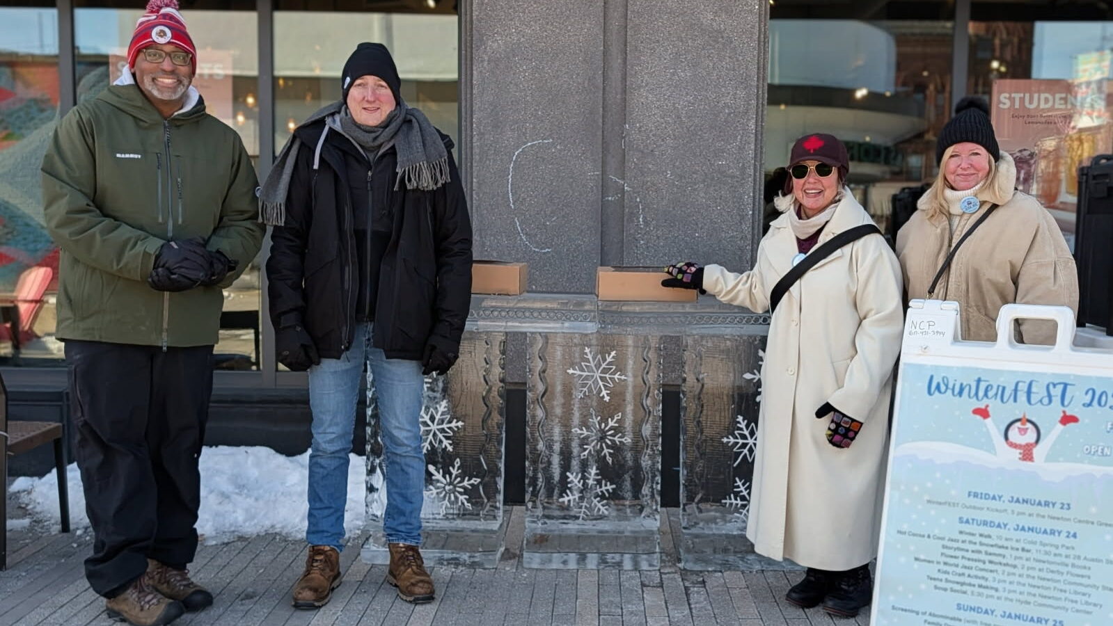 Left to right: Newtonville Area Council members Harvey Young, Richard Huddleston, Laura DeVeau and Suzanne Cuccurullo hand out hot cocoa on the second day of WinterFEST on Jan. 24, 2025. Photo by Bryan McGonigle