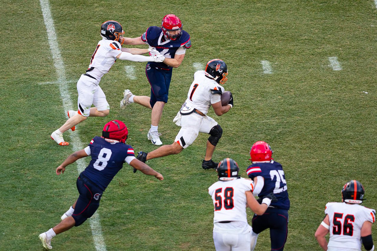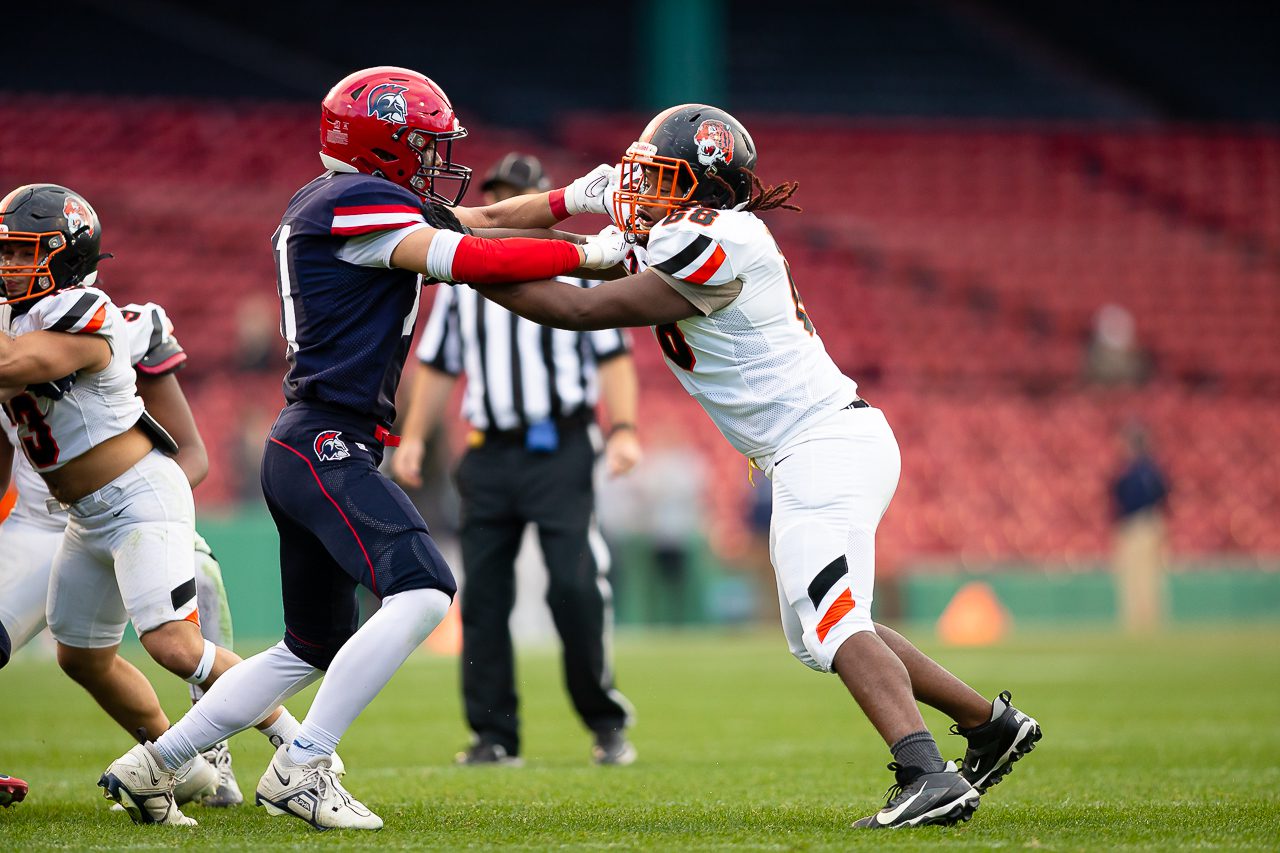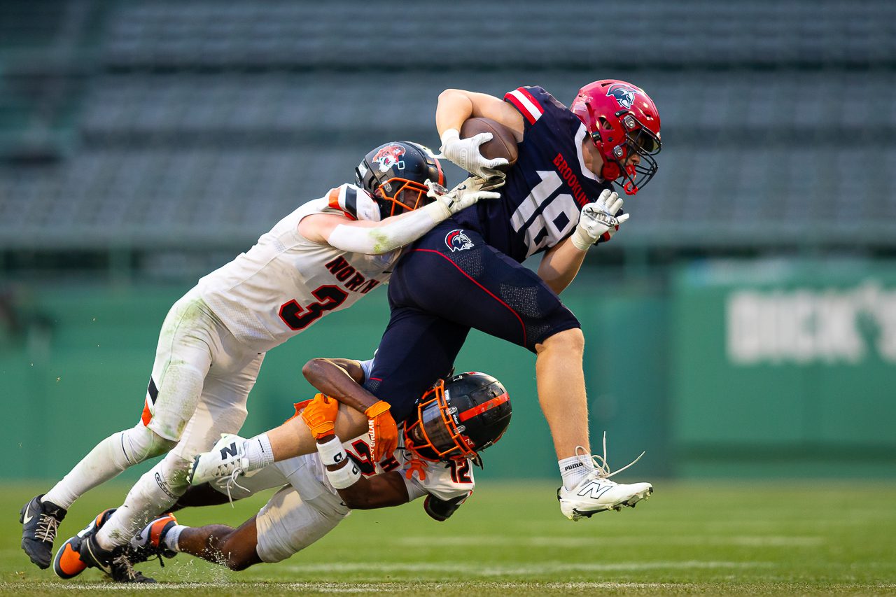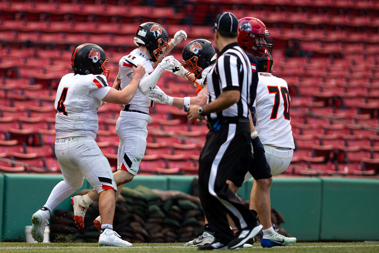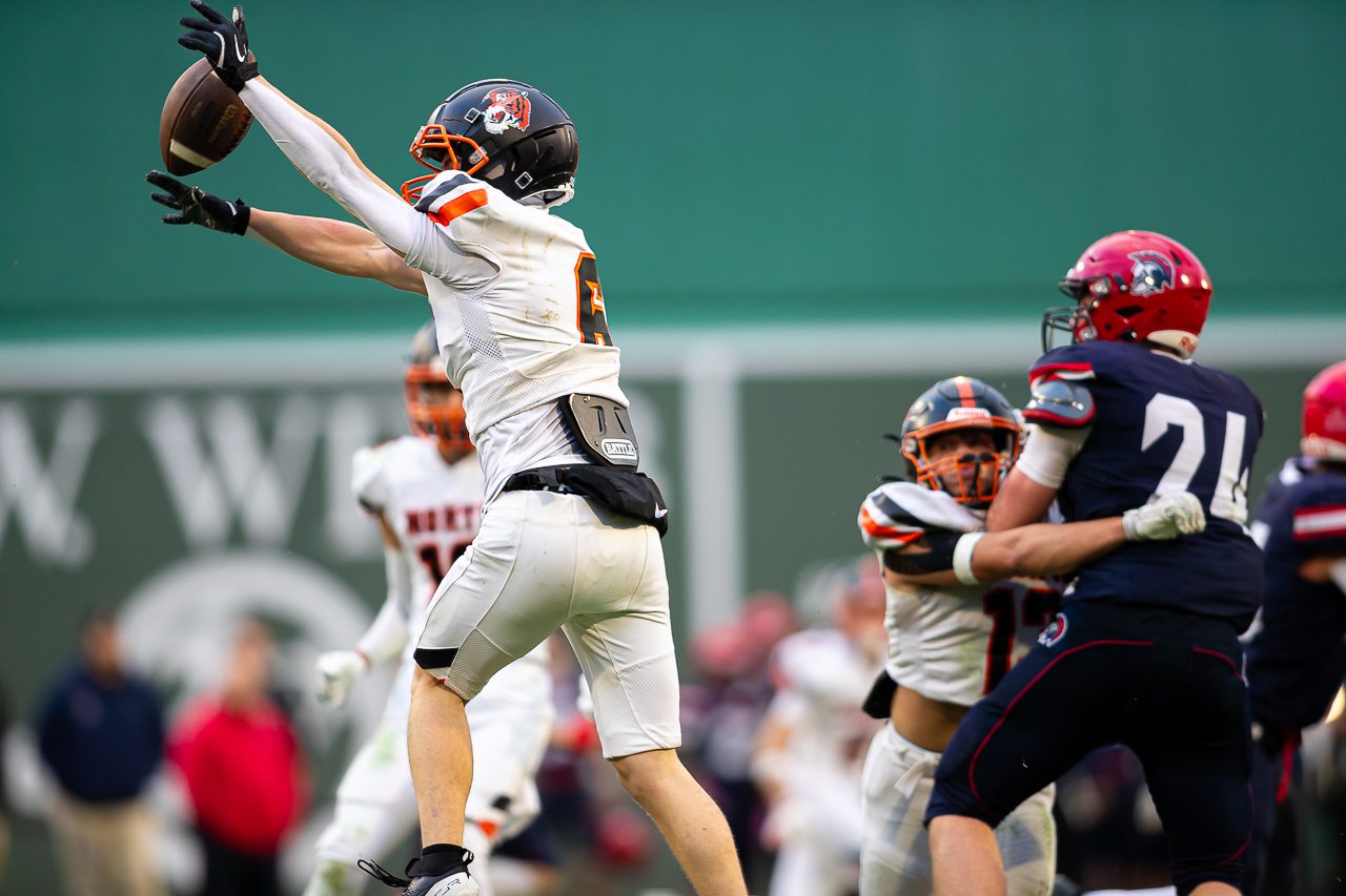 North’s fans who had traveled to Fenway for the historic game were finally rewarded in the fourth quarter. Leone broke through for a short score, cutting Brookline’s lead to 13-7. Then, on Brookline’s next possession, Jacob Goodwin blocked a punt deep in Brookline territory, setting the Tigers’ offense up in prime real estate. A Torcasio touchdown pass to Milo Schneider made it 14-13. With the momentum now firmly on North’s side, the Tiger defense stepped up and smothered the Brookline offense to seal the win.