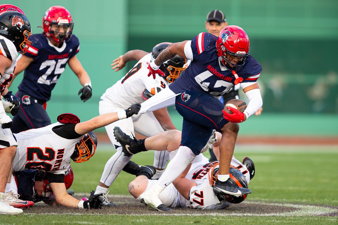 Dylan Leone (1) runs past the Brookline defense in the third quarter. North would eventually turn the ball over on downs just outside the Brookline end zone. (c) Burt Granofsky/Newton Beacon